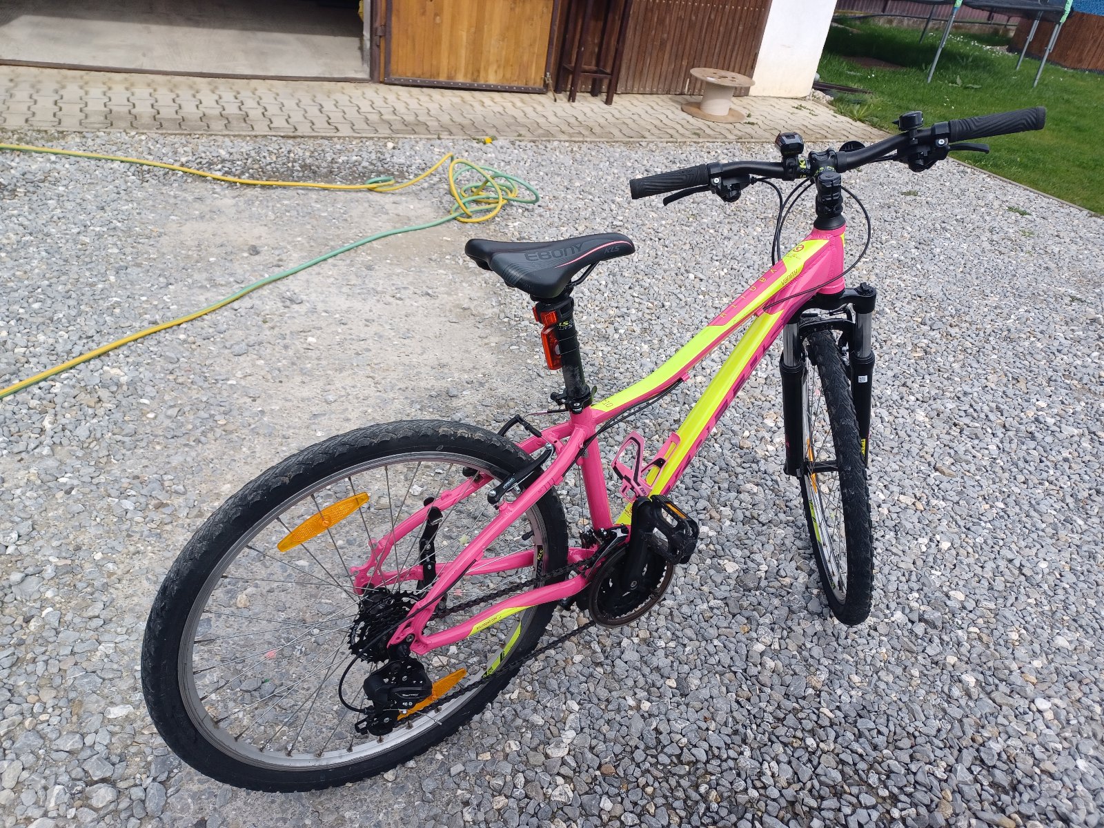 Predám krásny ružovo-žltý bicykel zn. Kellys, model Vanity, veľkosť S 375, veľkosť kolies 26, so stojanom a namontovaným držiakom na fľašu. Veľmi málo používaný, v TOP stave.