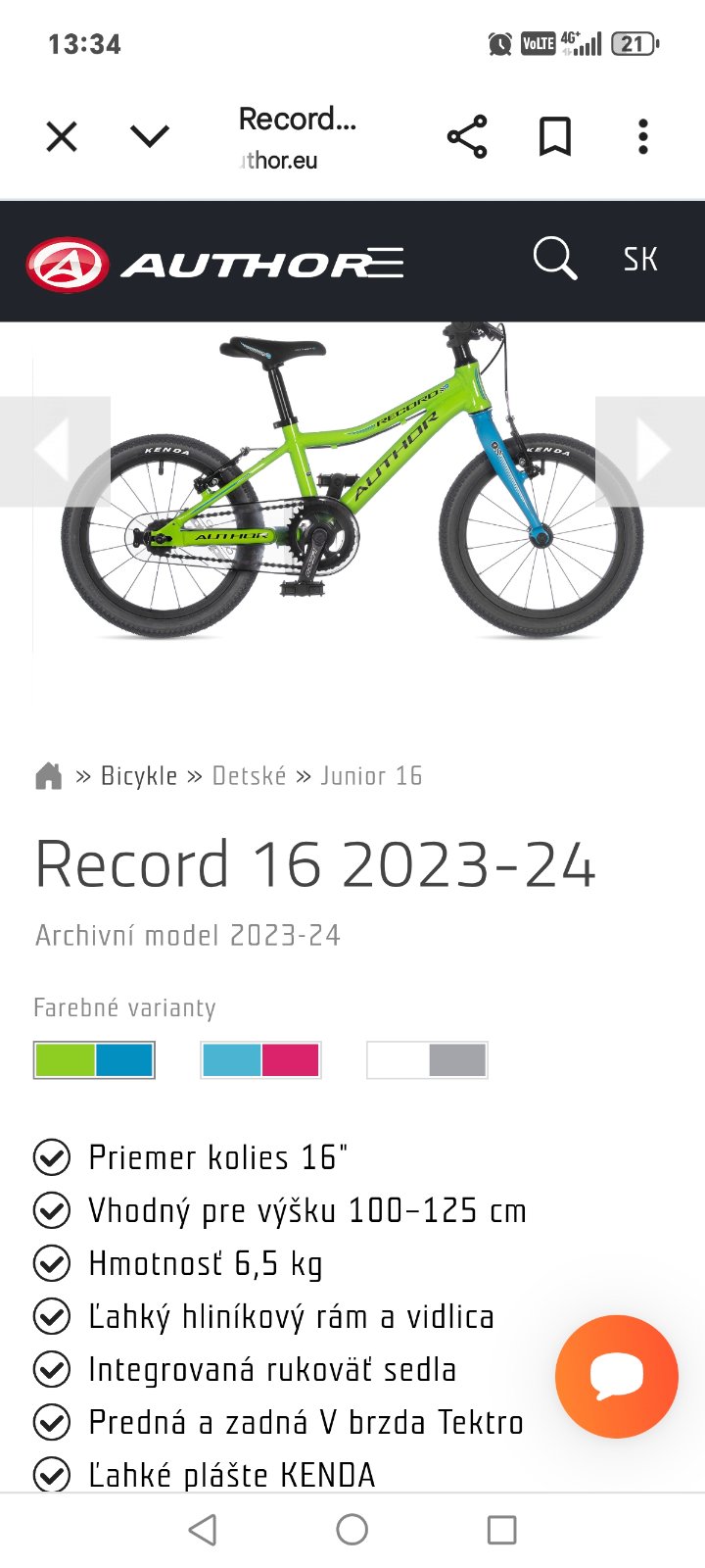Predám dve sezóny jazdený bicykel Author record s váhou len 6,5kg, veľkosť kolies 16 a veľkosť rámu 9. Má bežné škrabance, akurát brzdy sú viac ošúchané. Predáva sa bez zámku.