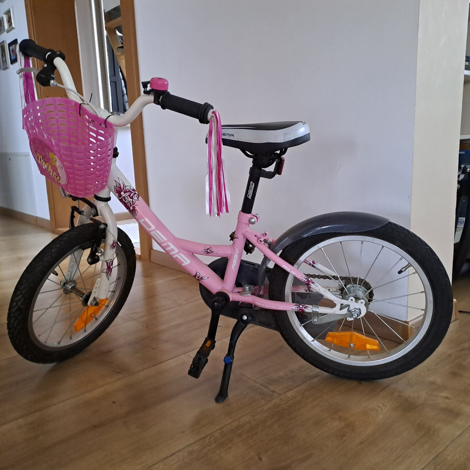 Predám používaný bicykel pre dievčatá. Bežné opotrebenie pri používaní, plne funkčný. Ozdoby na riaditkách. Veľkosť pre cca. predškolákov. K tomu priložím aj ochrannú prilbu.