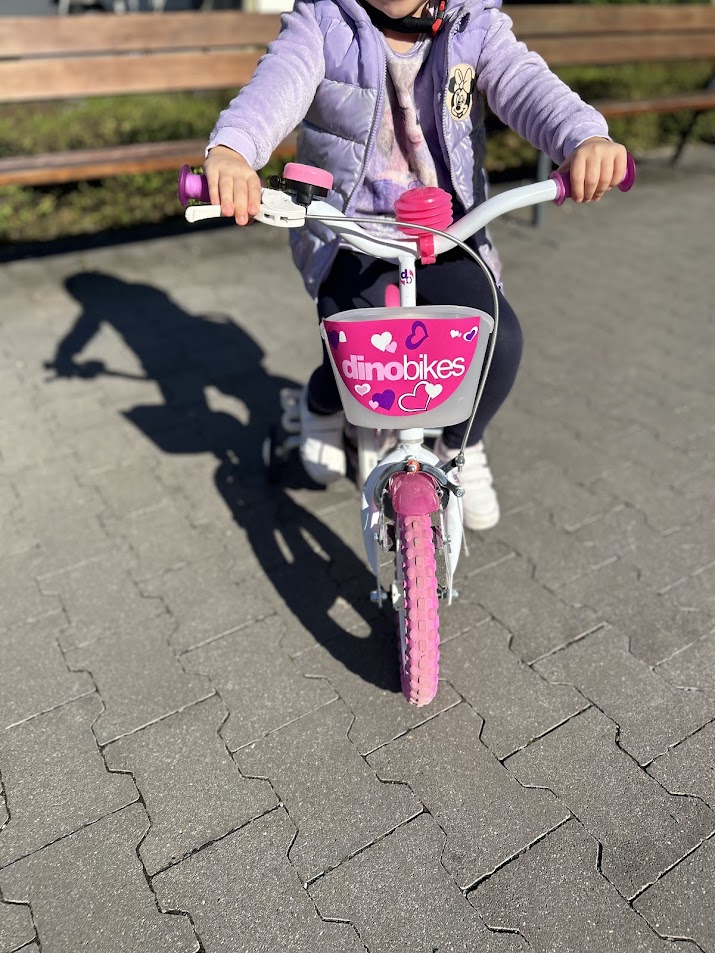 Detský bicykel Dino, ružový. Veľkosť kolies 12". Vzadu sedačka pre bábiku a vpredu košík pre všetky potrebné veci :-) Bicykel má prednú čeľusťovú brzdu a stály prevod, tzv. "furtšľap".