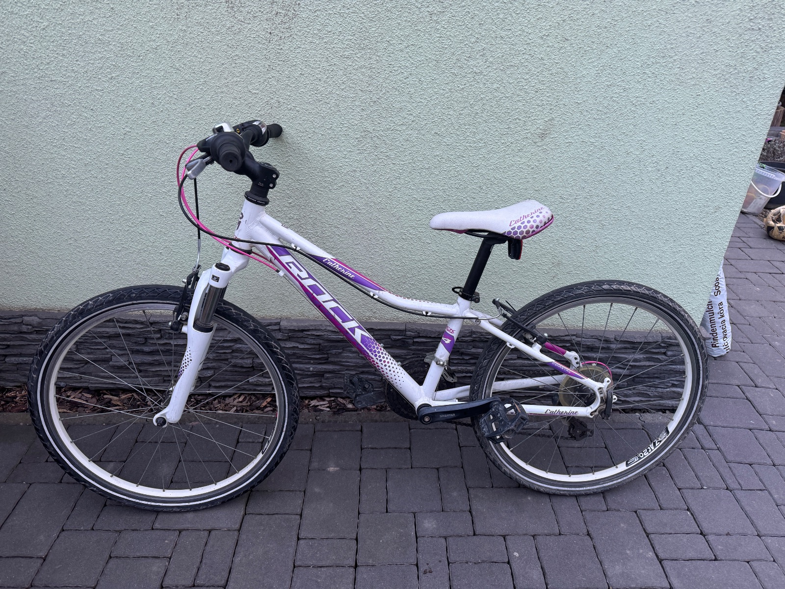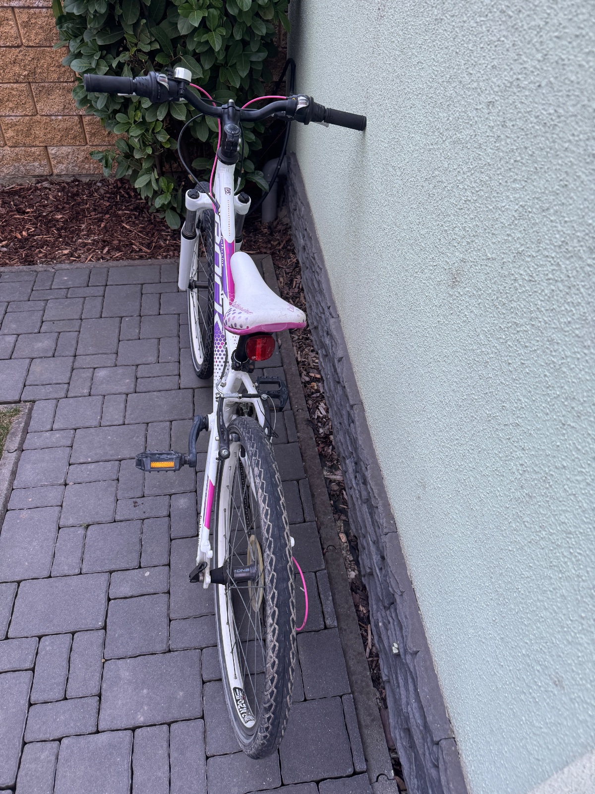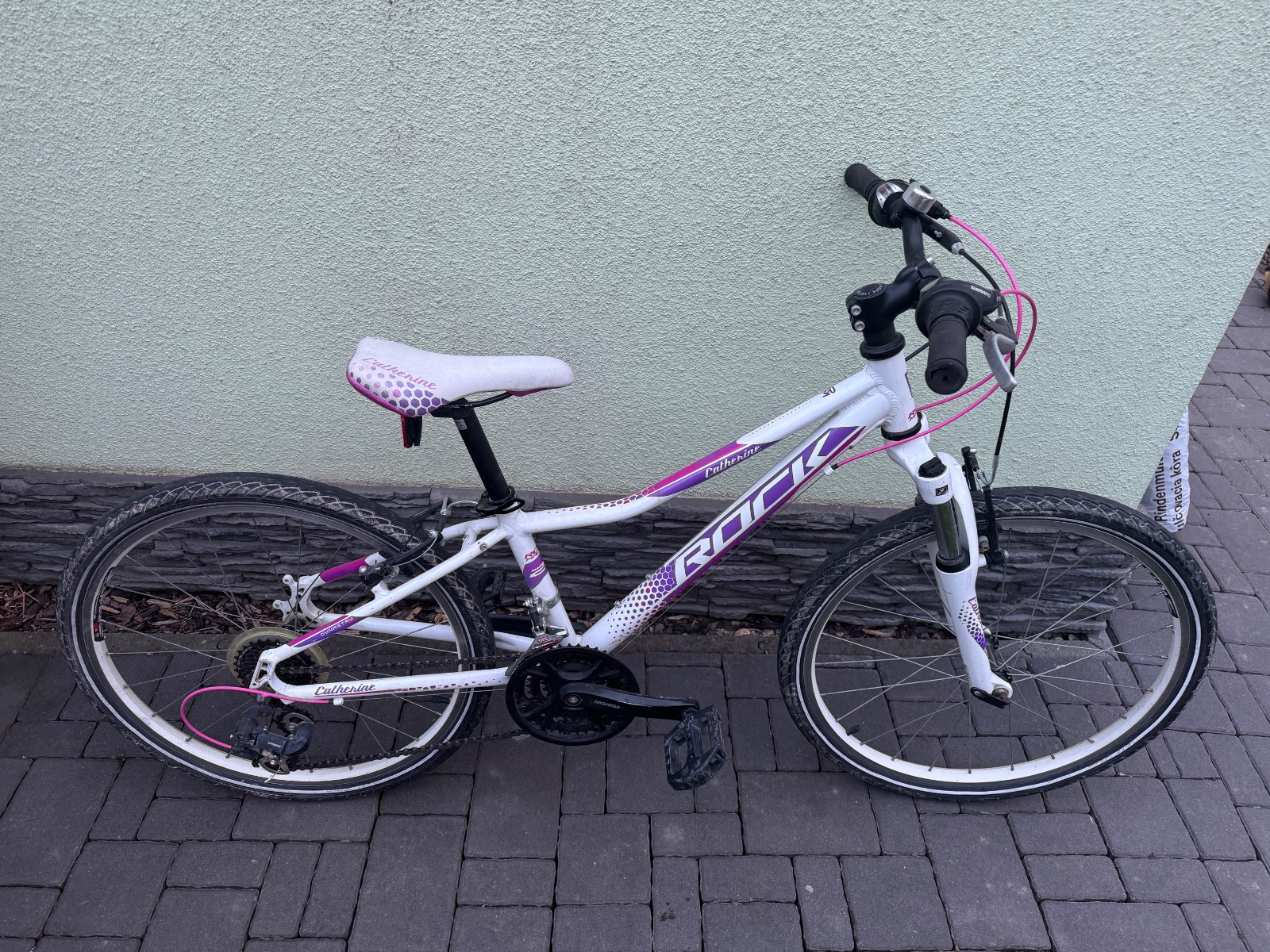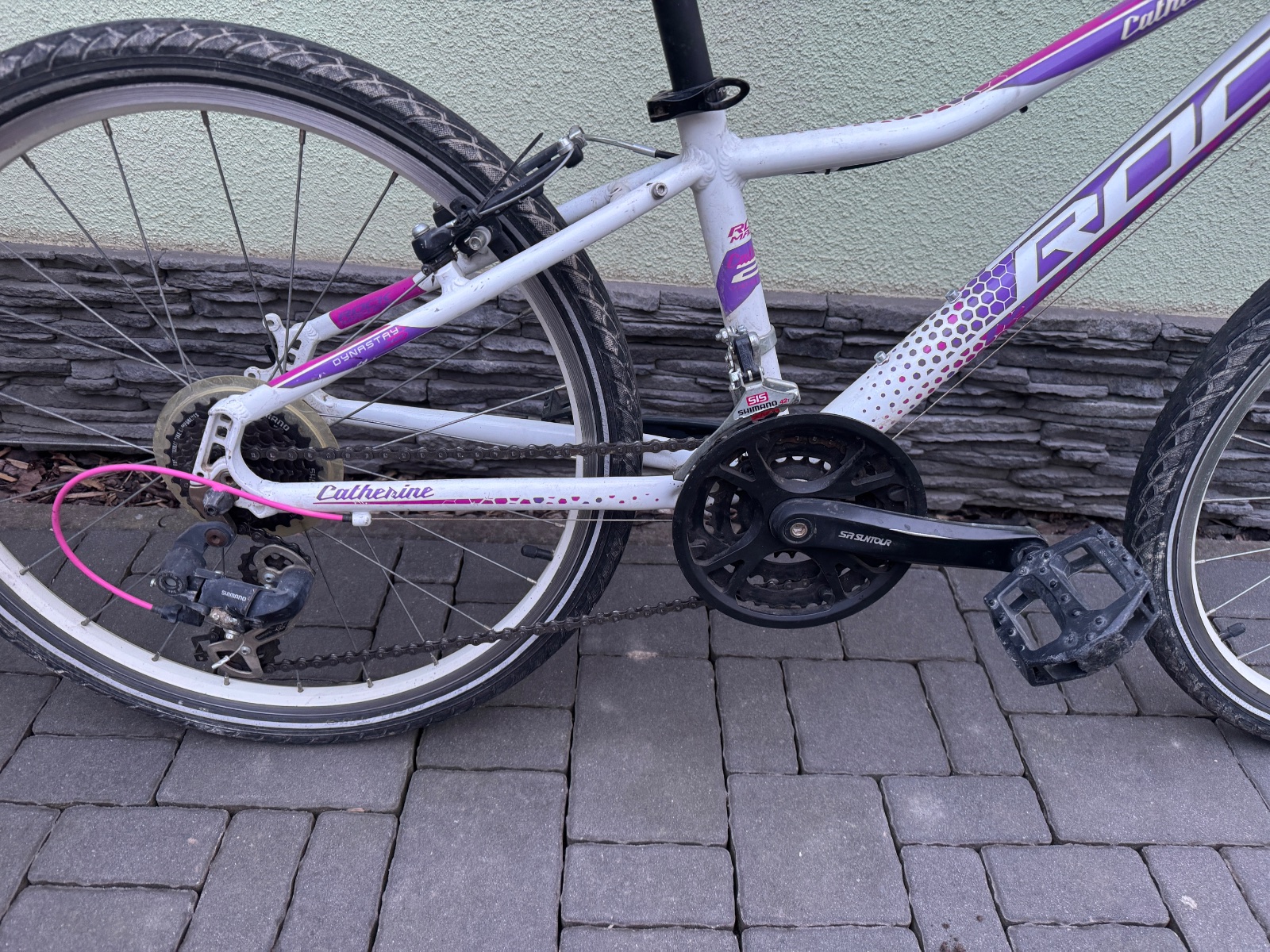 Dievčenský bicykel, podľa mňa 24, do 12 rokov. Zachovalý stav, už nám 4 rok stojí v pivnici, všimla som si, že začína chytať chytať koroziu na riaditkach. Treba ho vyčistiť. Opraviť, nastaviť brzdy...