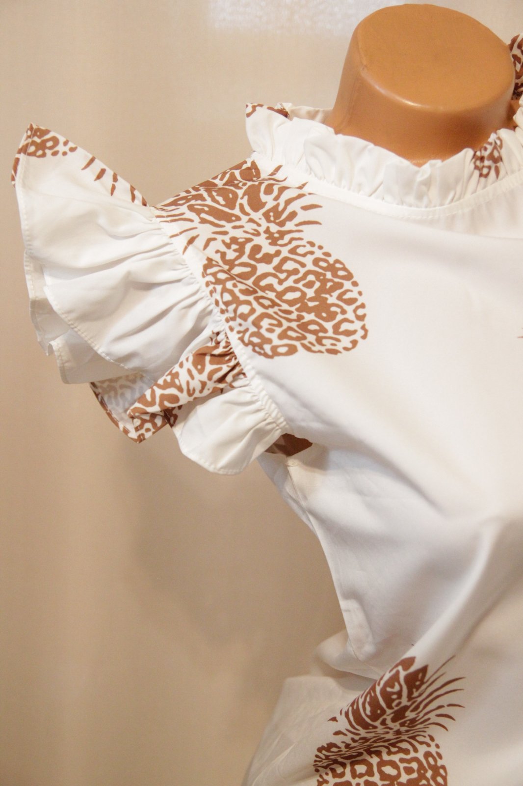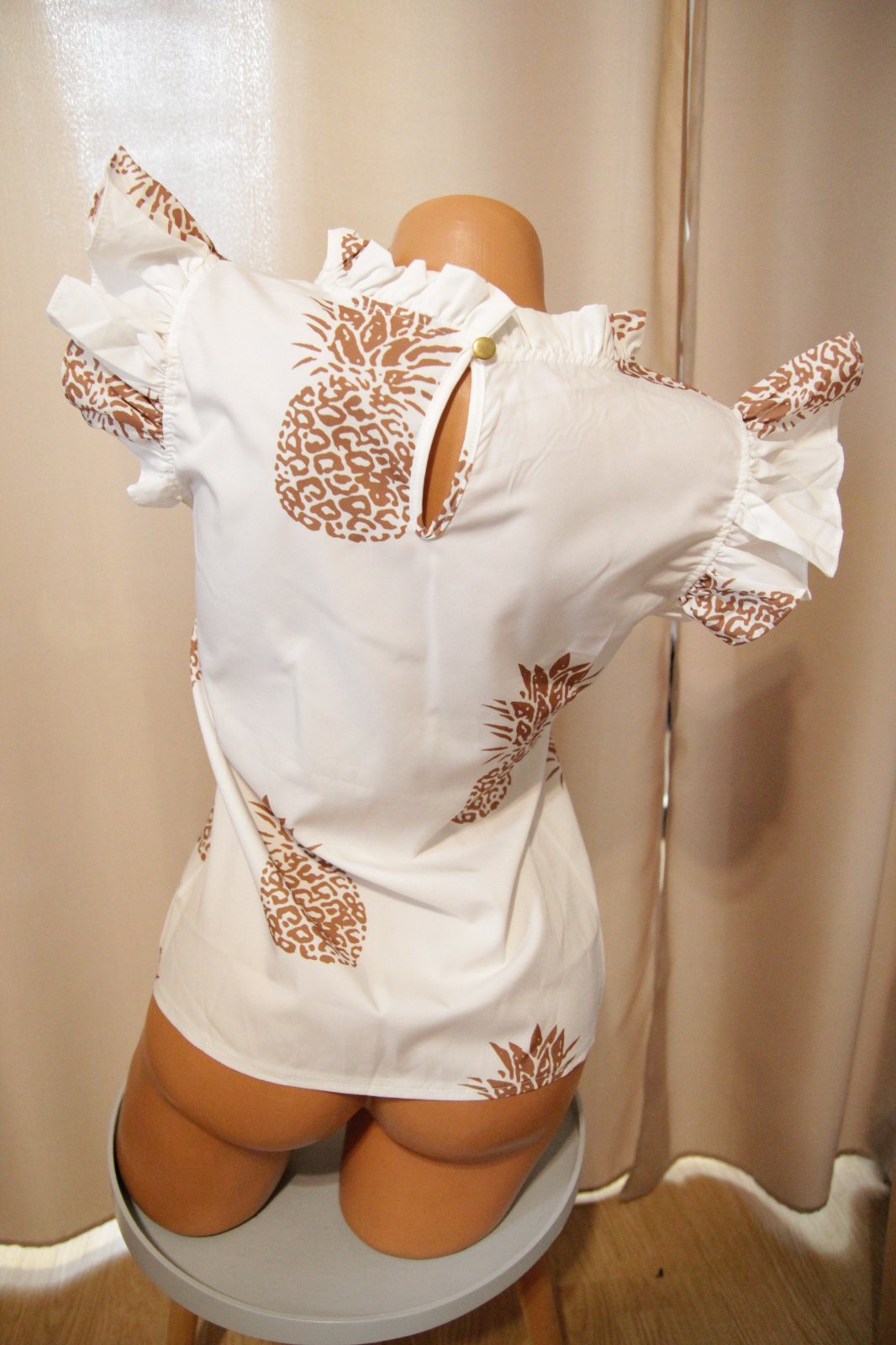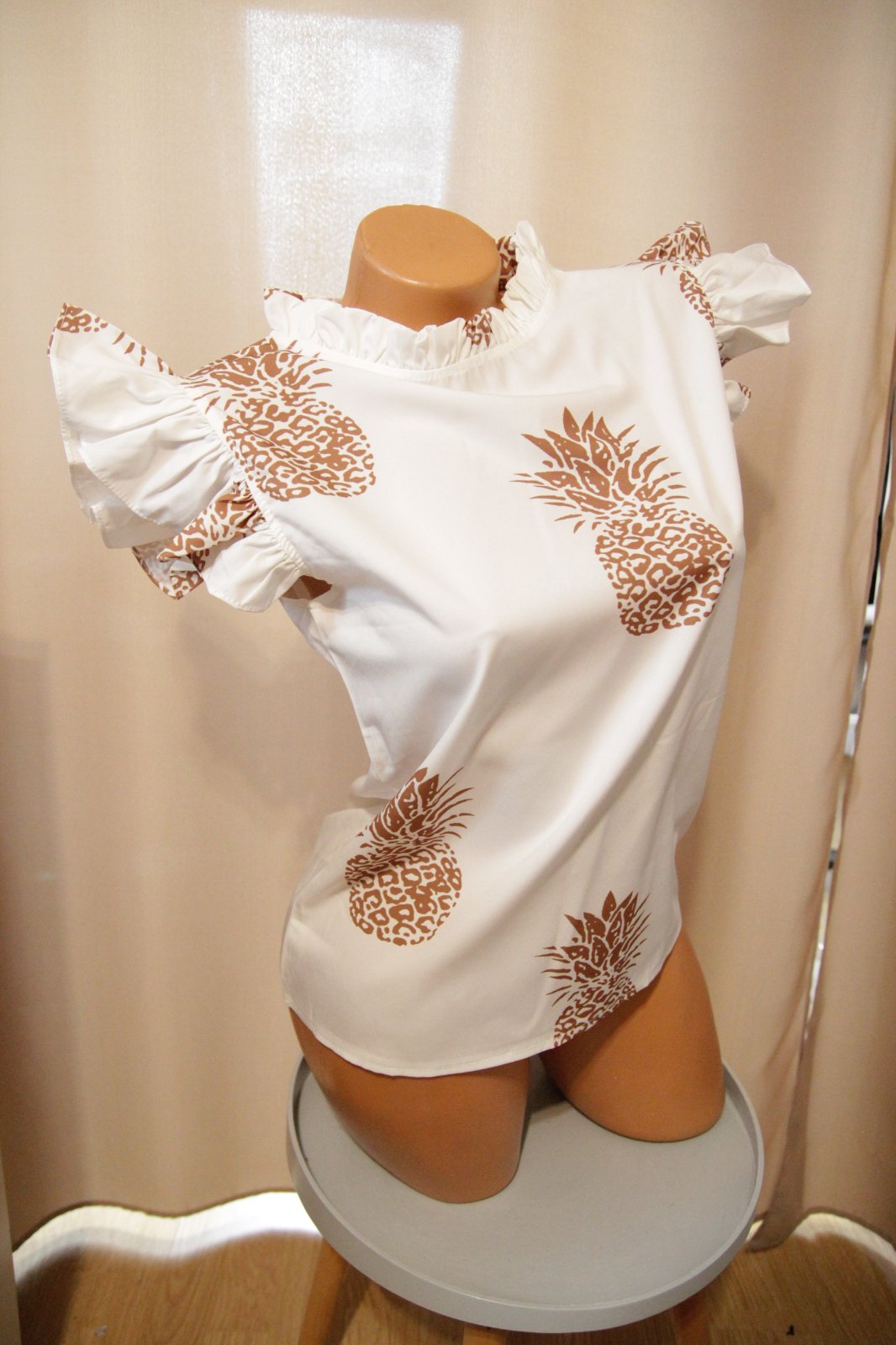 Biely top s ananásmi a volánmi na rukávoch. veľkosť S. Top stav.