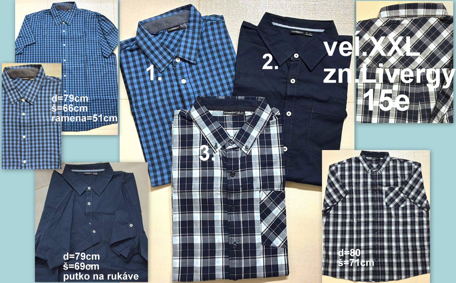 Predám 3 košele s krátkym rukávom, veĺ.XXL, zn.Livergy, 1: d=79cm, š=66cm, ramená=51cm, 2: d=79cm, š=69cm, pútko na rukávoch, tmavo modrá farba, 3: d=80cm, š=71cm, málo nosené top stav, aj jednotlivo, 1kus 5e, v prípade kúpe 3ks možná zĺava