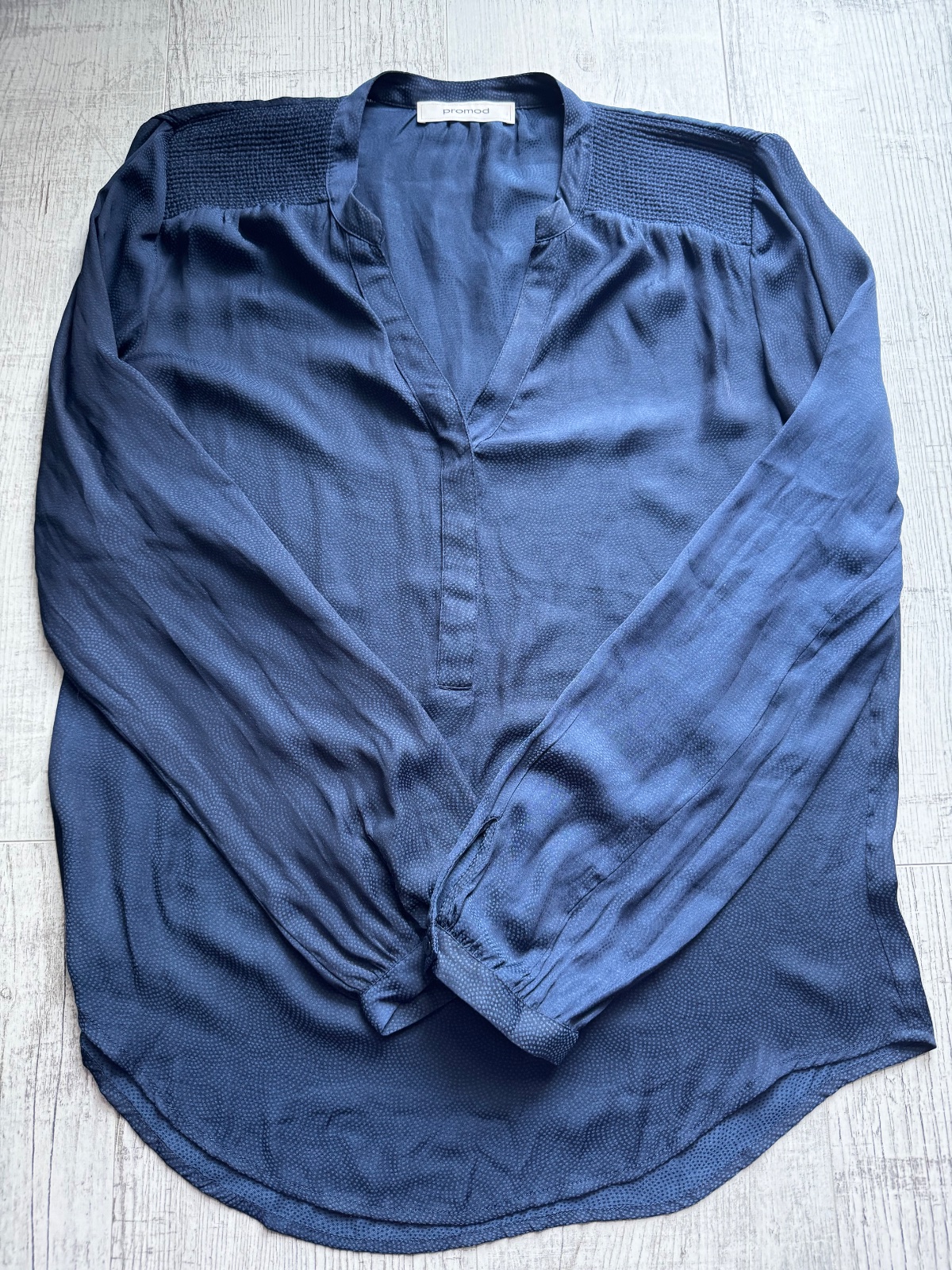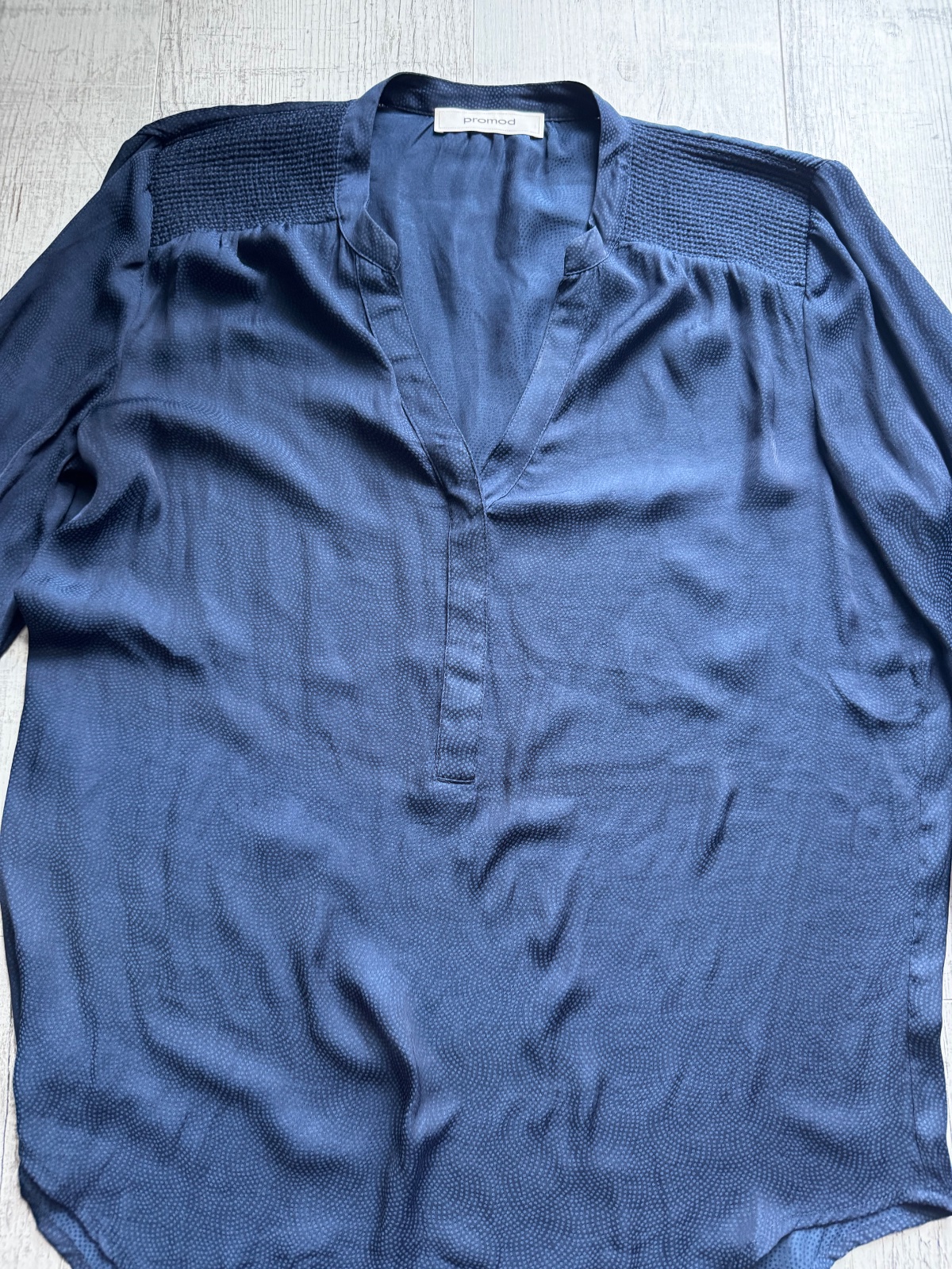 Tmavomodrá bluzka so sivými vzormi, detailmi. Top stav, oblečená raz. Plus poštovné...