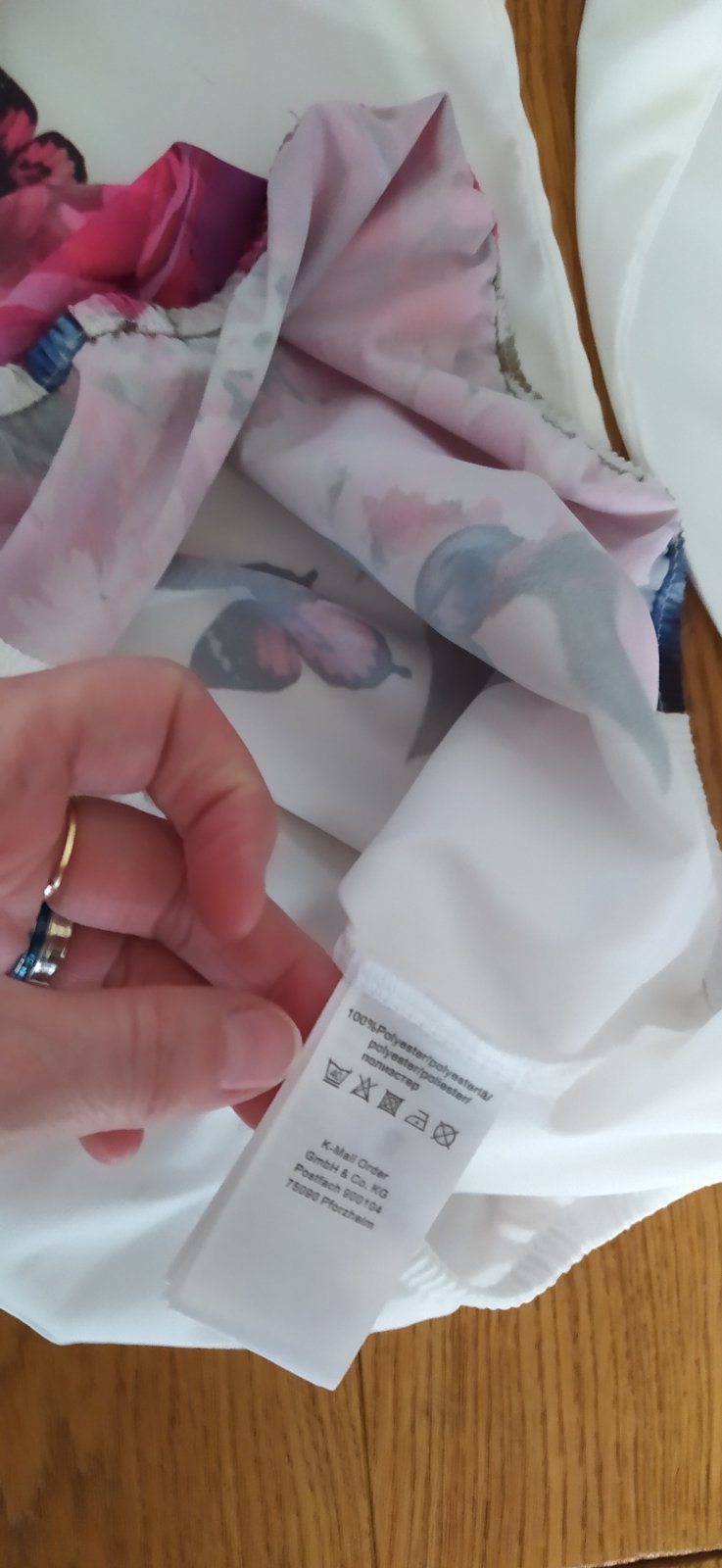 Biela padavá blúzka z viskózy, vpredu dvojitý materiál. So striebornými nitmi. Bezchybná. Dlžka 76 cm, širka cez prsia 48 cm, rukav od goliera 72 cm.