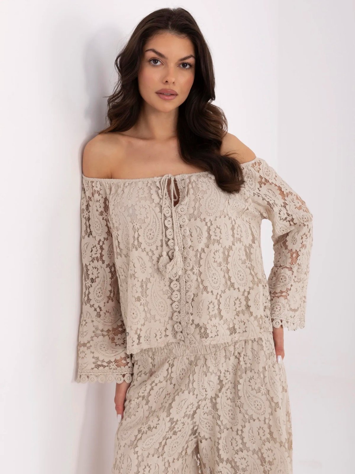 Romantická, ženská a ideálna na leto – naša dámska blúzka s čipkou a voľným strihom v boho štýle je must-have kúskom tejto sezóny. Vyrobená z jemného čipkovaného materiálu, má lodičkový výstrih, ktorý sa dá nosiť aj ako odhalené ramená. Rukávy sú dlhé, zakončené ozdobným lemom a celý dizajn pôsobí ľahko, no elegantne zároveň.