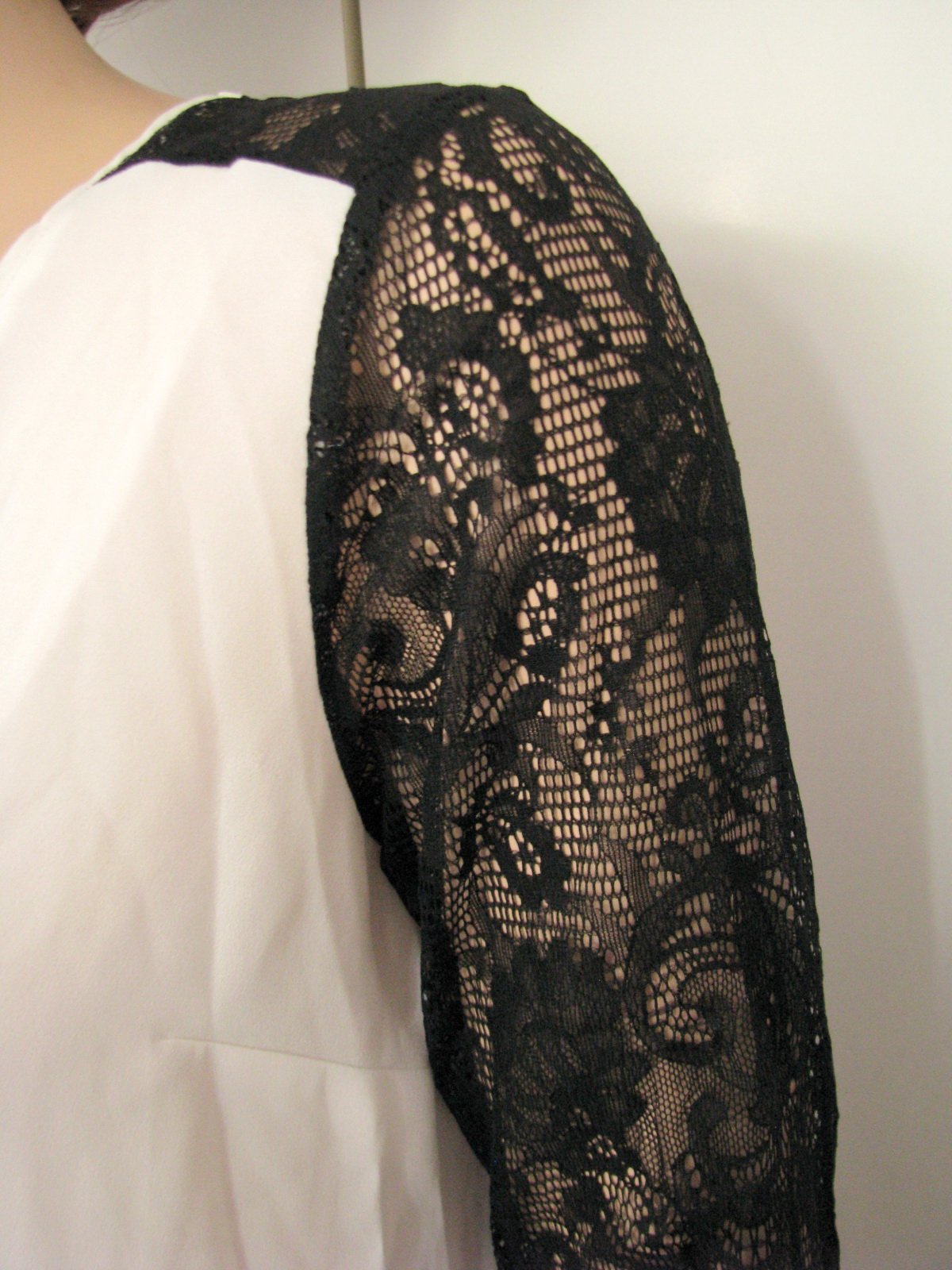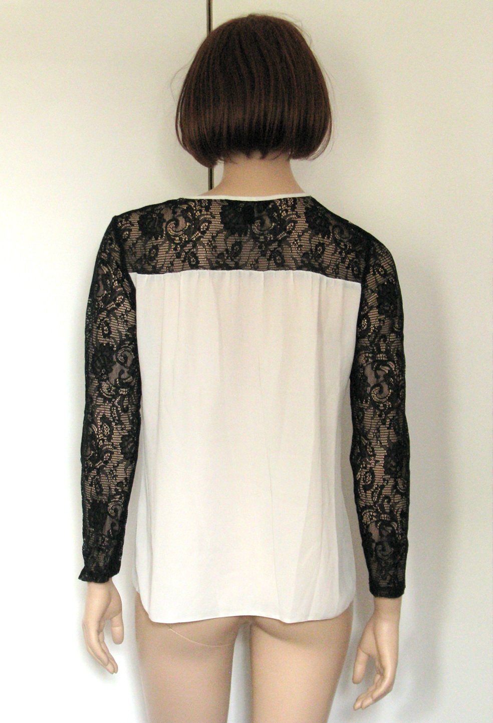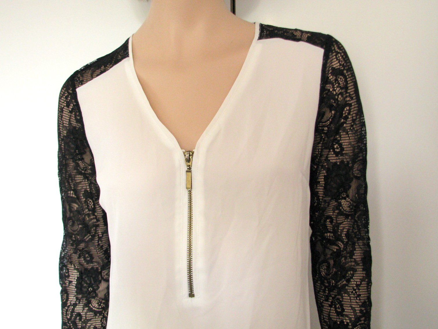 Zaujímavo riešená čiernobiela blúzka - biely šifón a čierna krajka, vo výstrihu zips. Pekne zachovalá, bez poškodení. Veľkosť píše 38, je to asi S - M (figurína je S). V prípade záujmu premeriam.