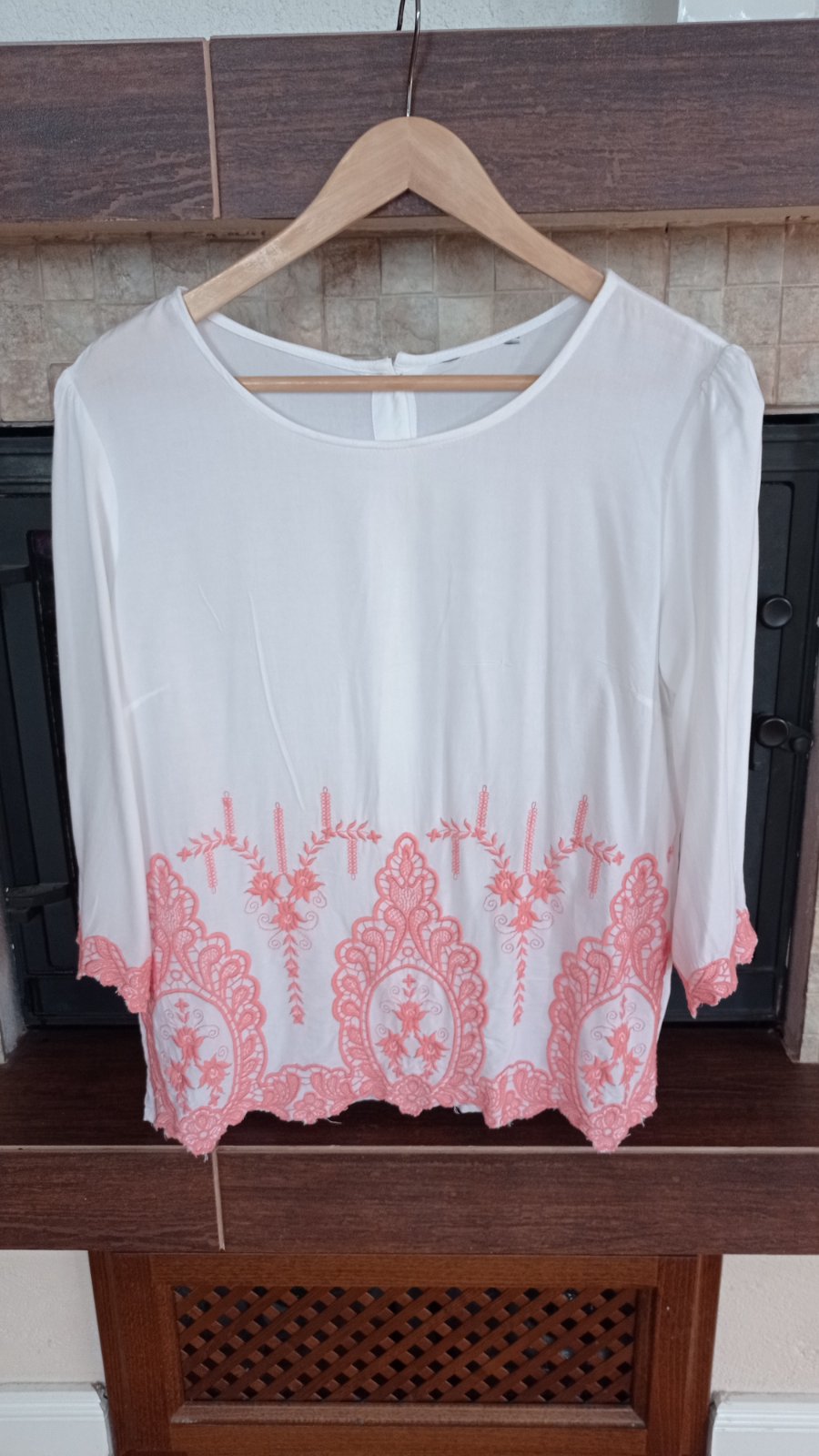 Biela široká viskózová blúzka, 3/4 široký rukáv do tvaru "A", veľkosť "M"; vpredu je biela výšivka, límec vpredu okolo krku má dekor čipky s kamienkami; vzdušná. Po opratí nie je potrebné žehliť. N...
