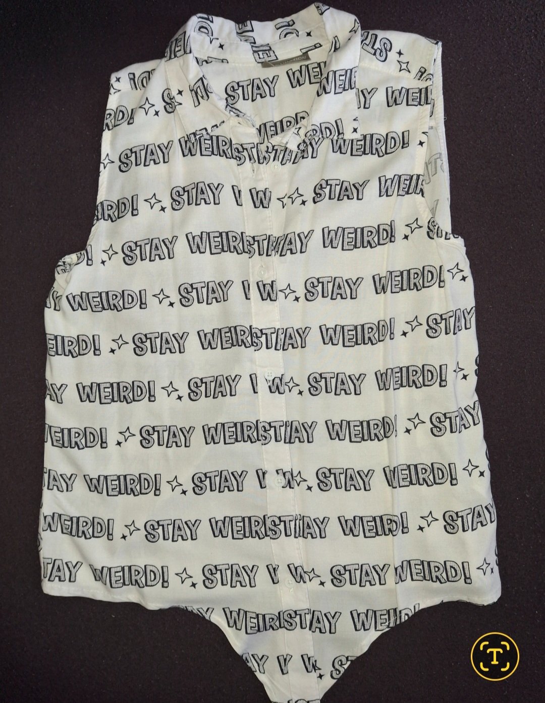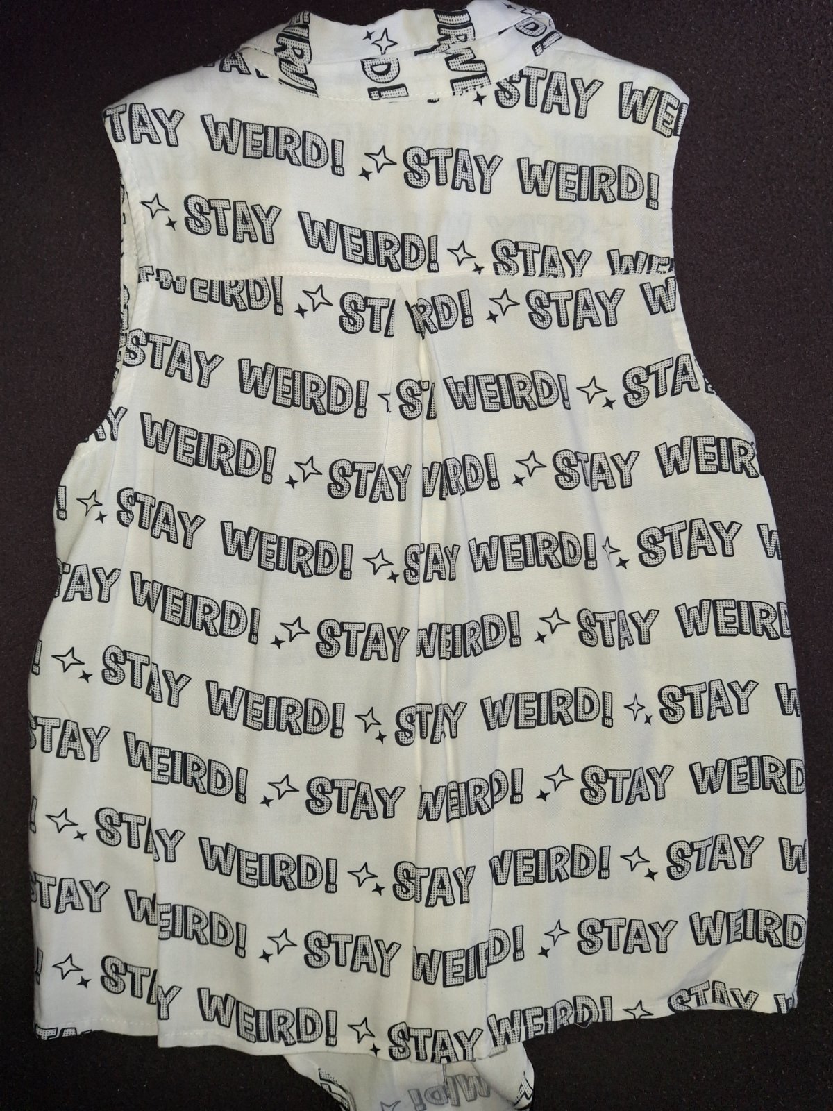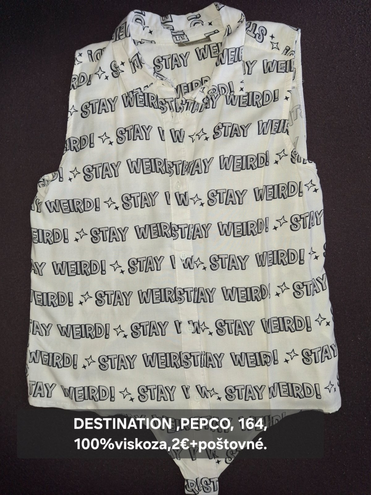 Predám malo nosenú blúzku s potlačou. " STAY WEIRD " ,Destination, 164, Pepco, v predu možno zaviazať na uzol, 2 €+ poštovné.