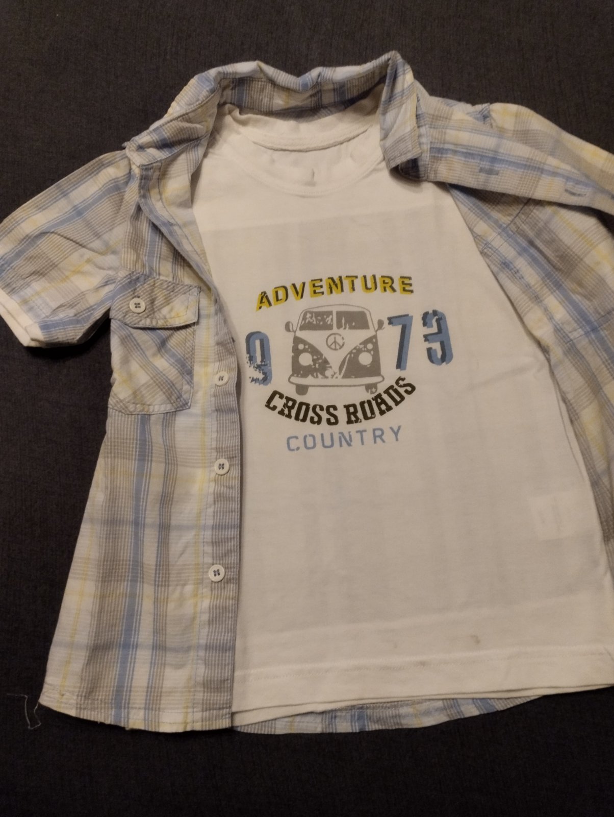 Košeľa s krátkym rukávom, kocka bledo modrá, biela a bledoseda, 2 vrecká, všite biele tričko s obrázkom, veľmi 110/116, nepoškodené