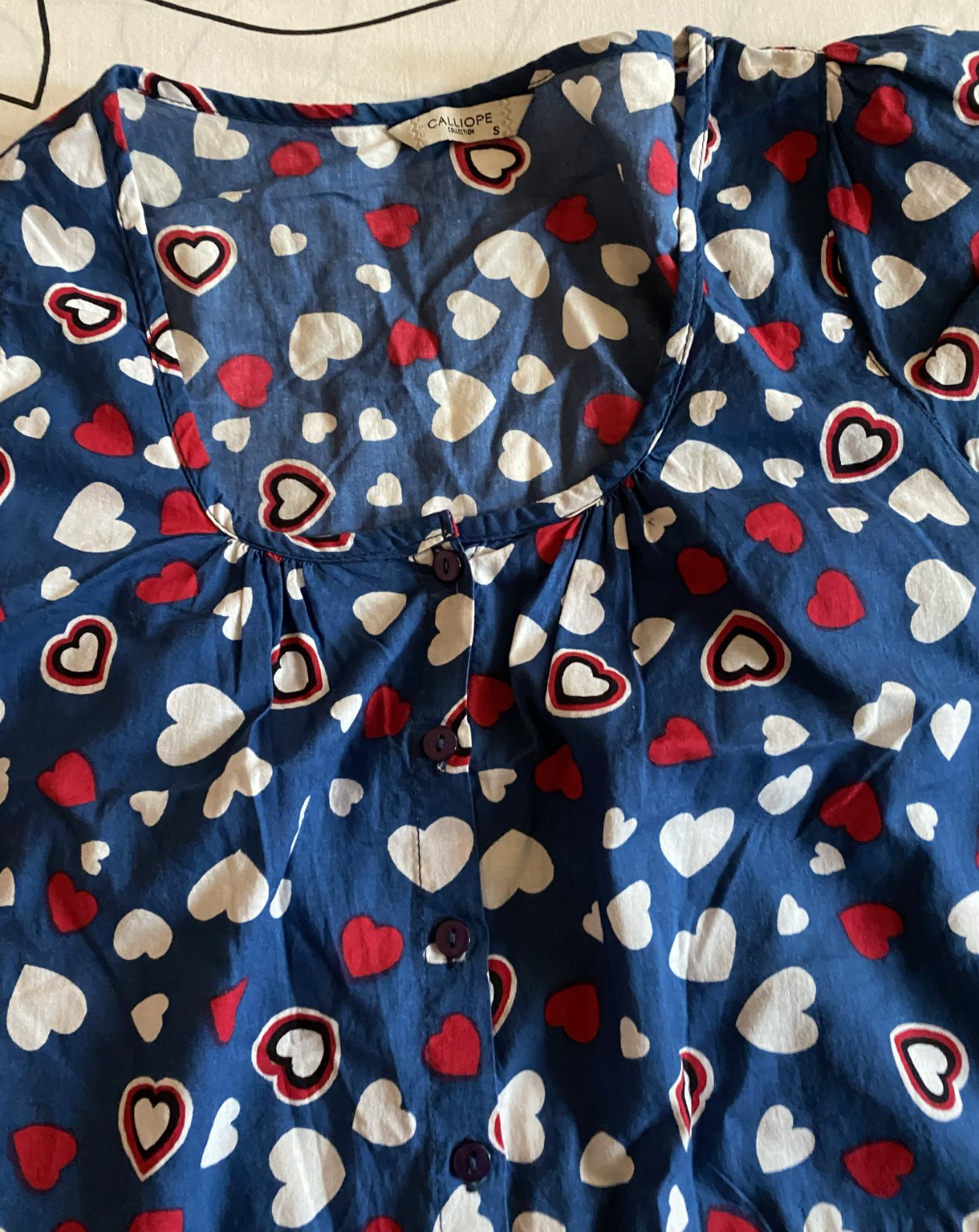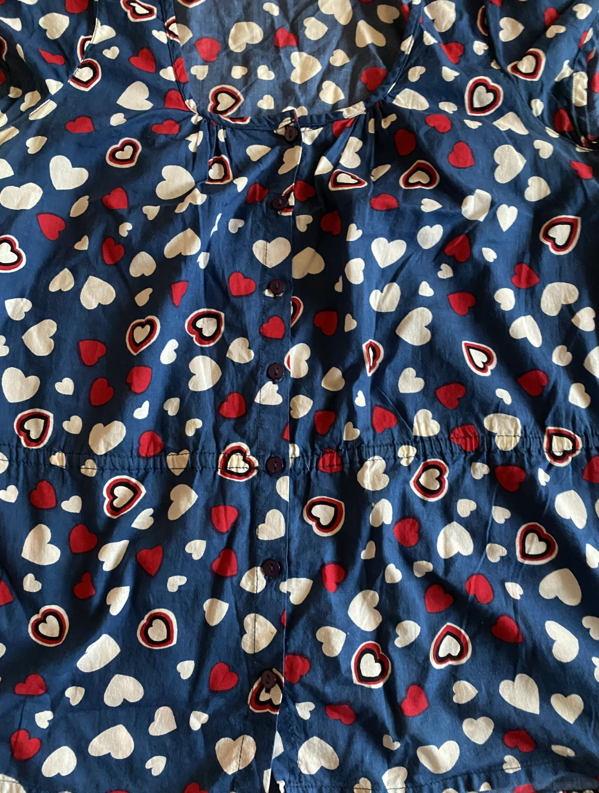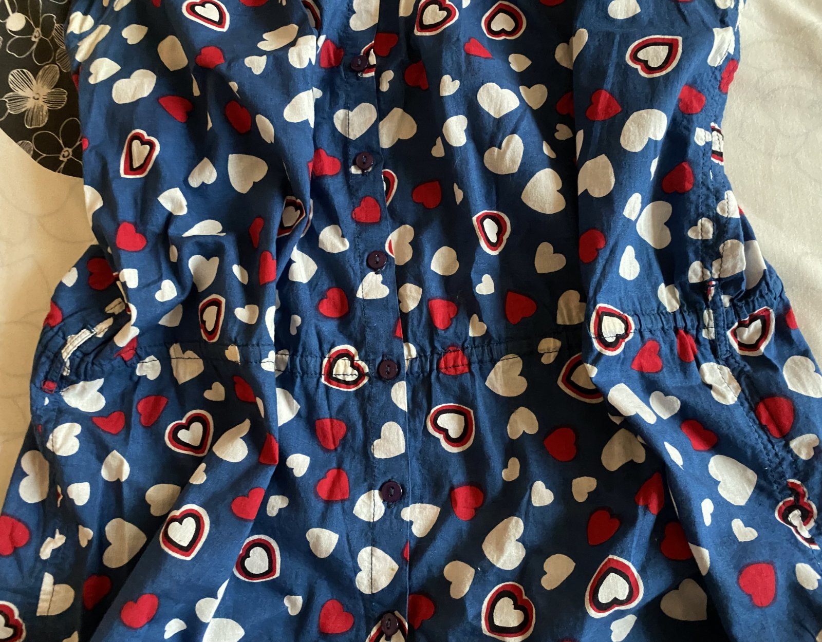 Ľahká letná blúzka - tunika so srdiečkami zn. CALLIOPE v. S, materiál 100% bavlna - ľahké plátno, vpredu zapínanie na gombíčky, v páse z vnútornej strany našitý tunel pre prípadné stiahnutie, z vonkajšej strany na bokoch slučky na opasok, pekné nevypraté farby, raz oblečená, ako nová. Miery: dĺžka od krku dolu: 60cm, šírka: 47cmx2.