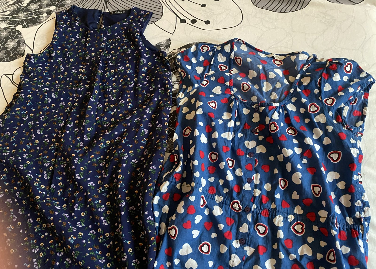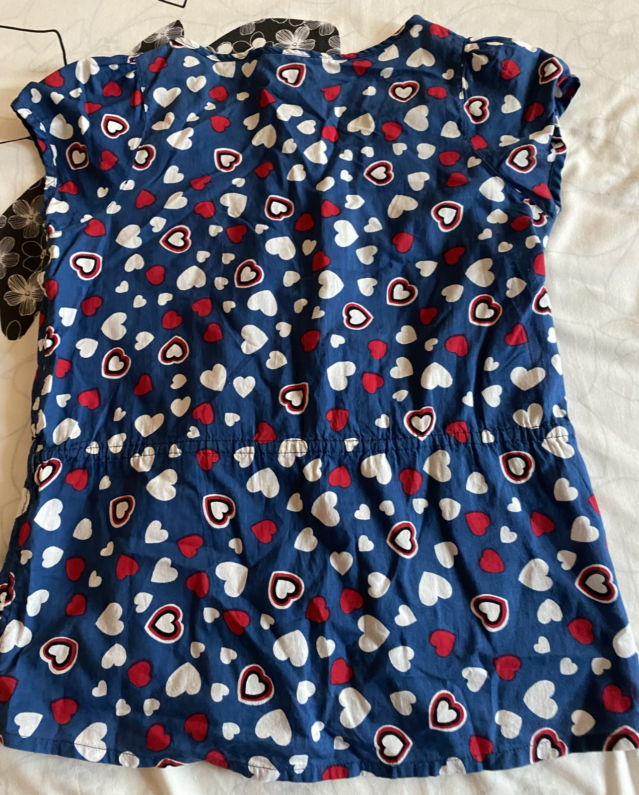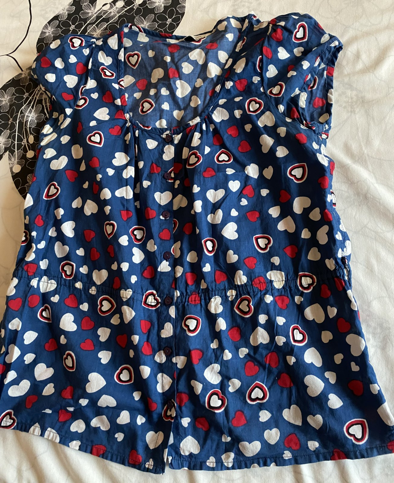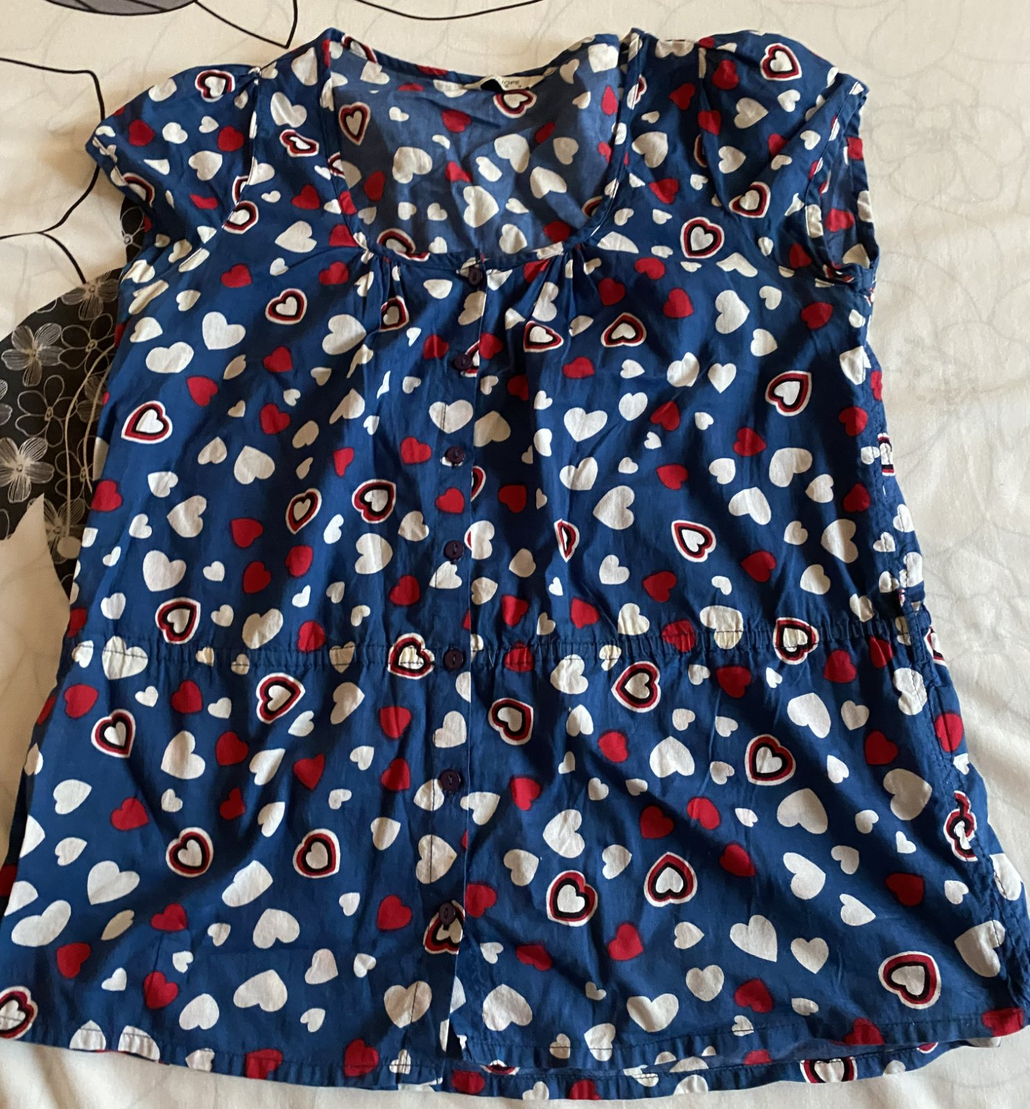 Ľahká letná blúzka - tunika so srdiečkami zn. CALLIOPE v. S, materiál 100% bavlna - ľahké plátno, vpredu zapínanie na gombíčky, v páse z vnútornej strany našitý tunel pre prípadné stiahnutie, z vonkajšej strany na bokoch slučky na opasok, pekné nevypraté farby, raz oblečená, ako nová. Miery: dĺžka od krku dolu: 60cm, šírka: 47cmx2.