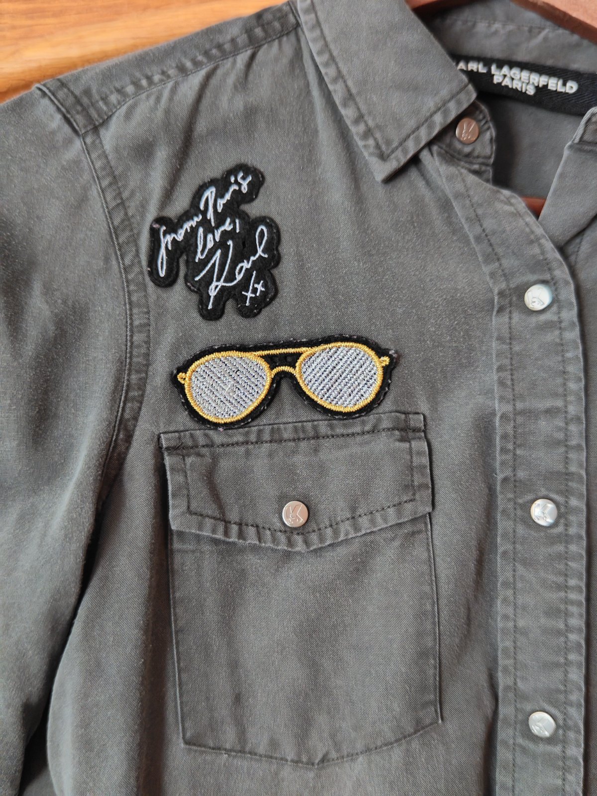 Nosená súprava štýlová košeľa zapínanie na patentky dva náprstné vrecká krásne našívané aplikácie original Karl Lagerfeld veľkostne S/M