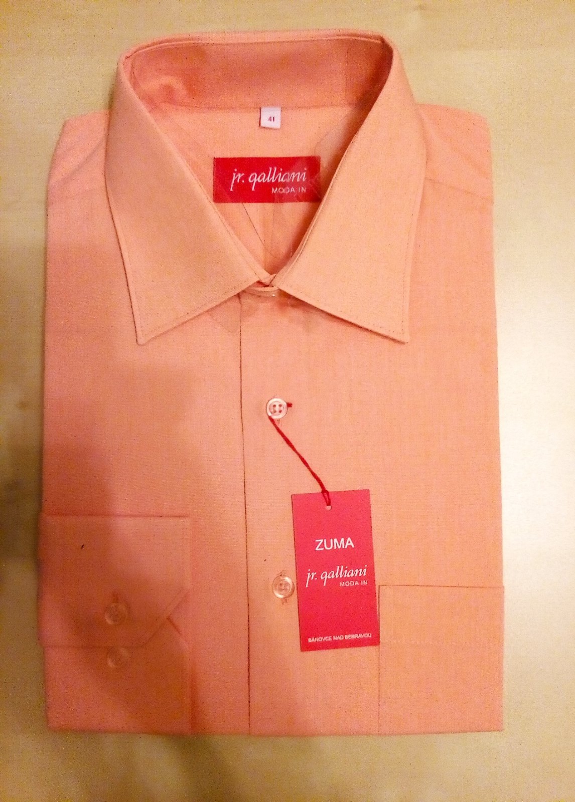 Predám veľmi peknú, novú pánsku košeľu veľkosť 41, broskyňovej farby, značka J.R.galliani, Bánovce nad Bebravou. Košeľa má rovný strih s jedným náprsným vreckom, dlhý rukáv.