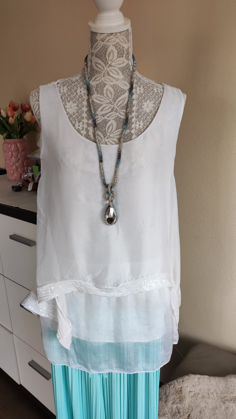 Krásna blúzka,tričko..dve vrstvy má,zvonku ako blúzka a zvnútra ako tričkovina,veľmi pohodlne.velkost Uni,rozmery Šírka prsia 53-56cm Dĺžka 65cm