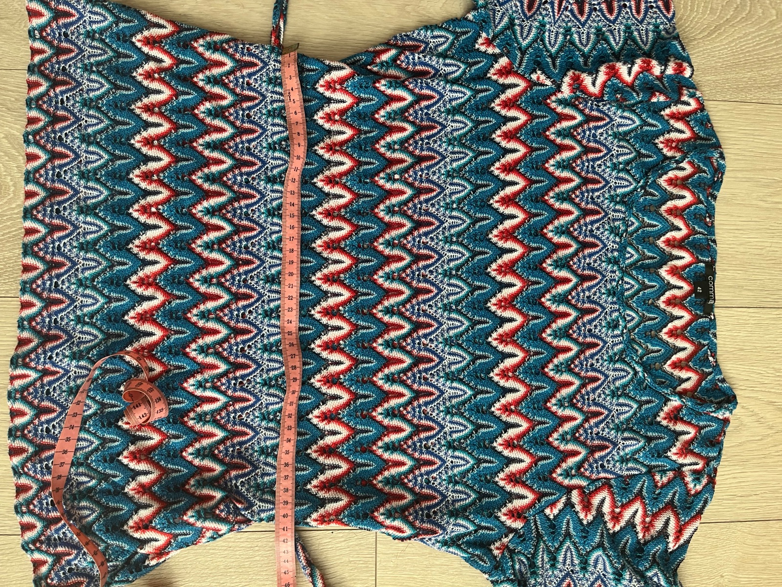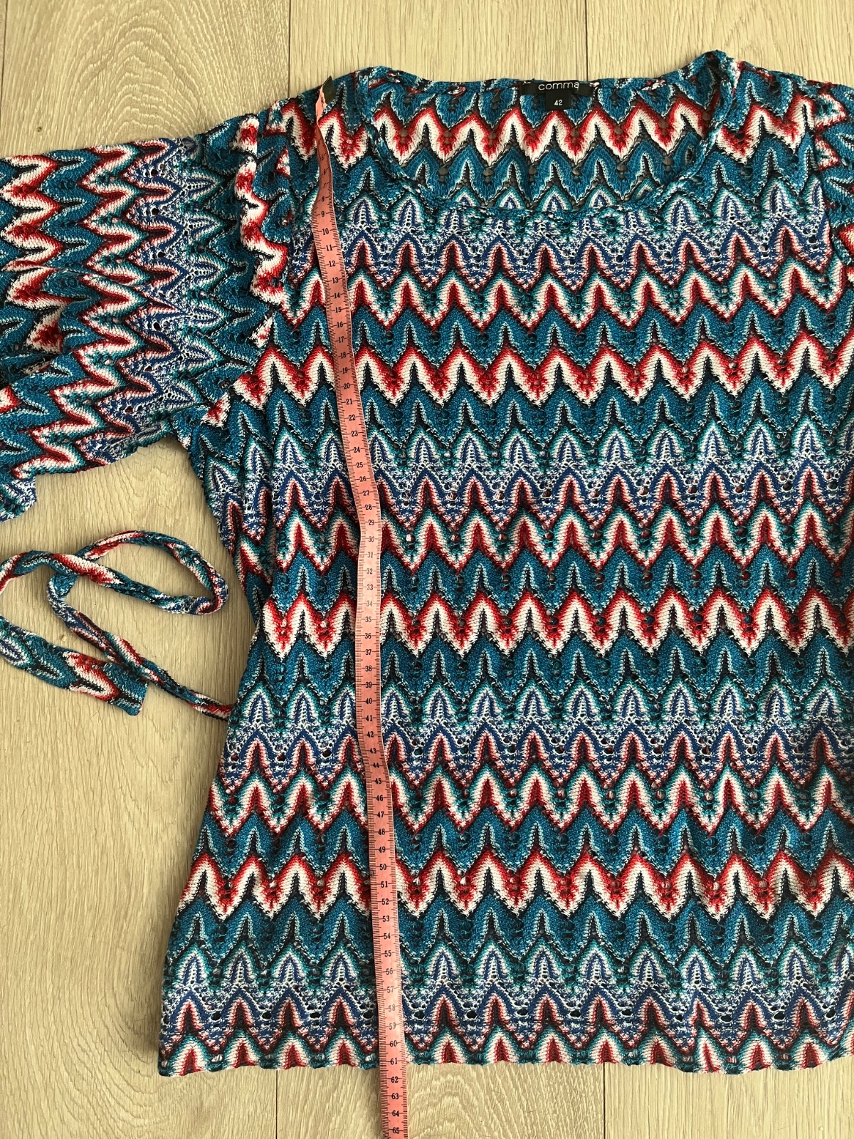 Materiál je úplet , skôr tenší, je to 100% bavlna. Dl. 60 cm, šírka cez prsia 53x2 cm, dl. 3/4 rukáva 45 cm. Blúzka je vo veľmi dobrom stave, bez poškodenia.