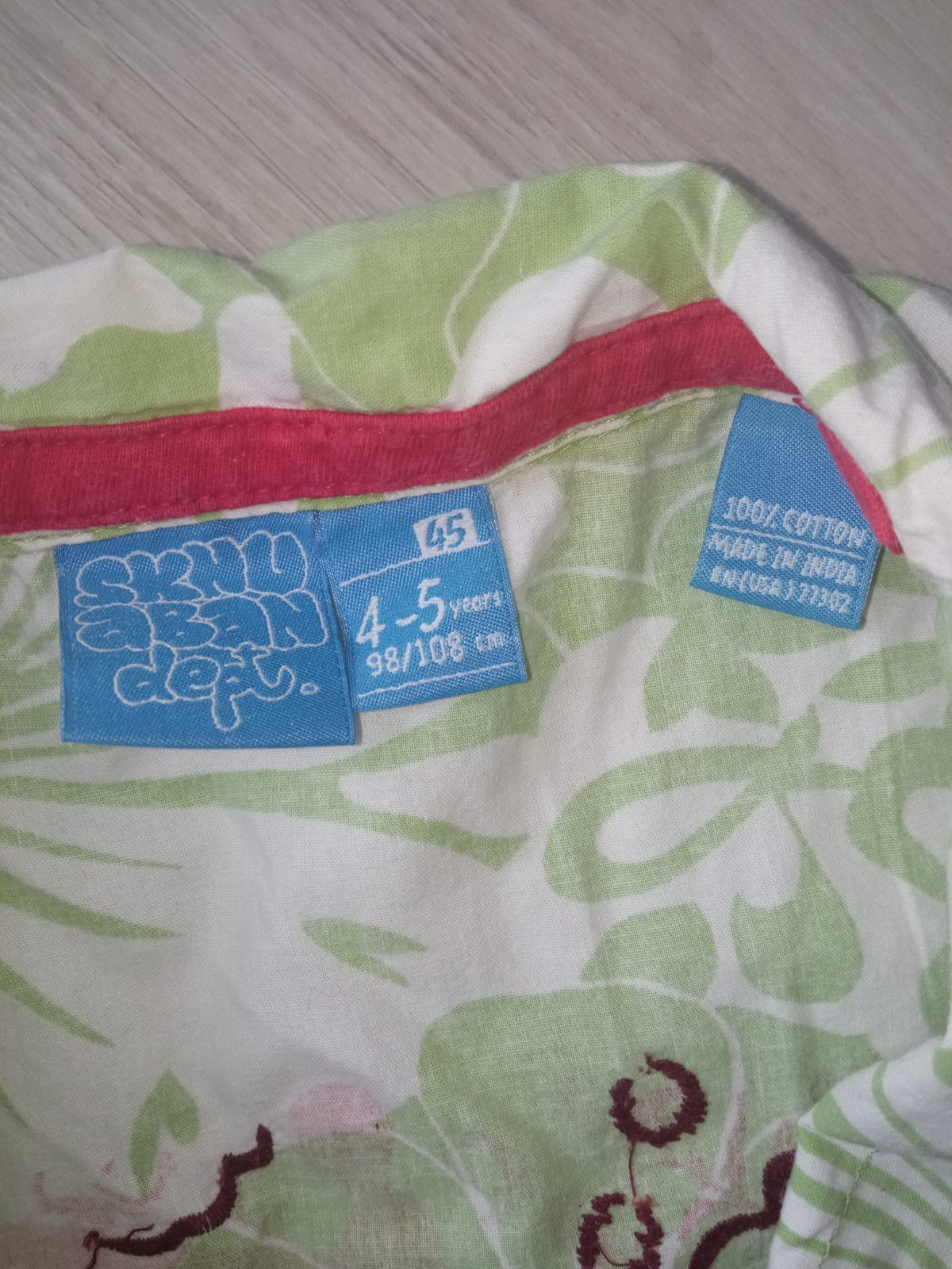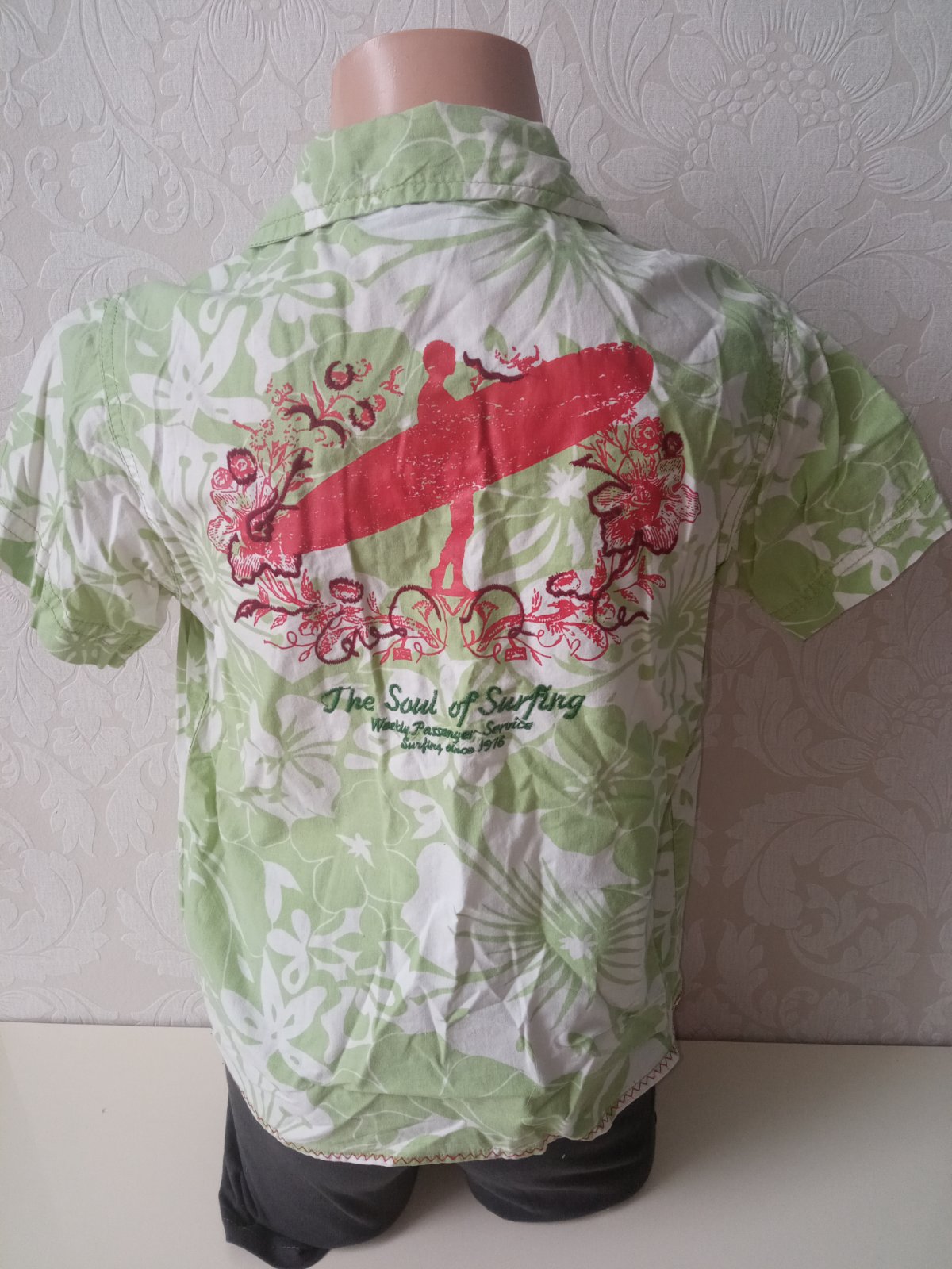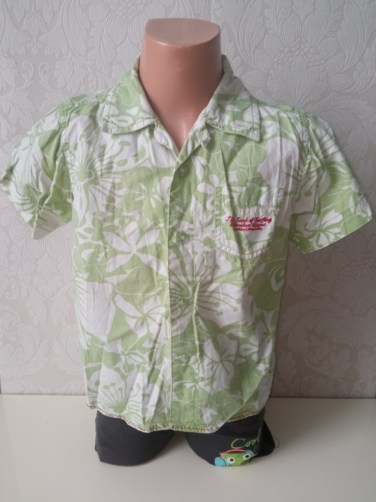 Chlapčenská vzorovaná košeľa s krátkym rukávom, nie je elastická, zapínanie na gombíky, vrecko na hrudi, vzadu vyšívaný vzor a potlač, pre 4-5 r., materiál 100%bavlna.