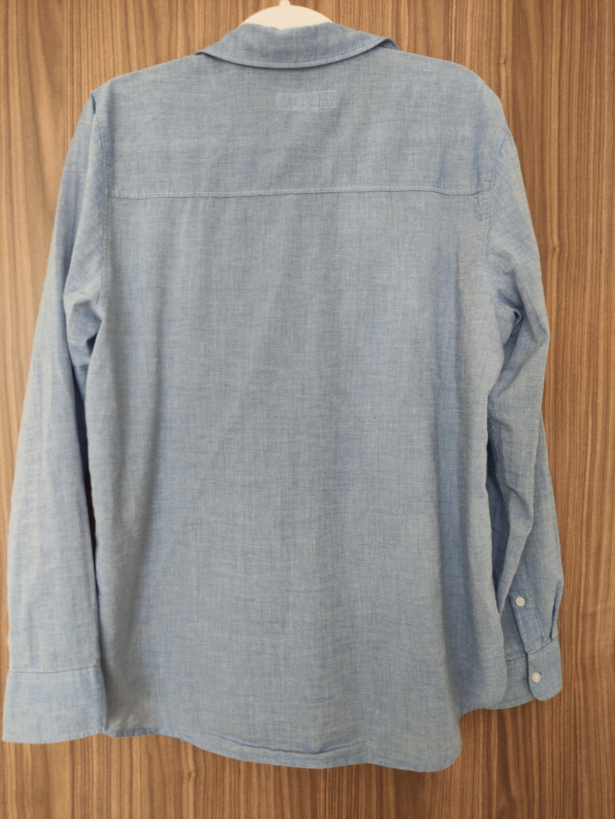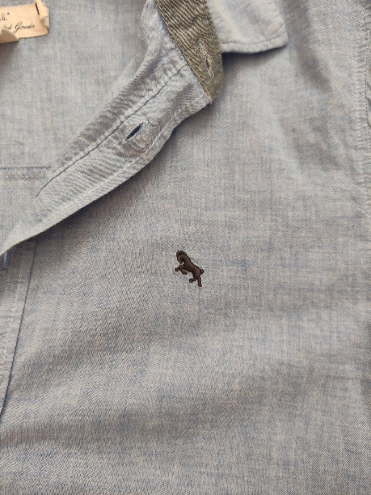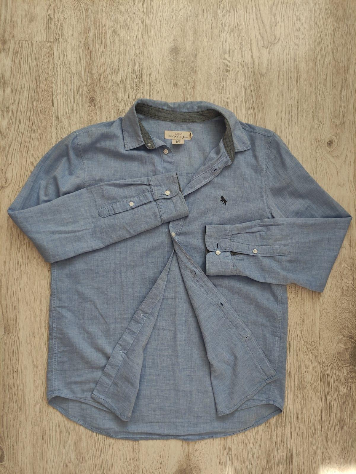 Predám málo nosenú bledo-modrú košeľu s dlhým rukávom značky H&M. Veľkosť č. 170, 14 r.+, nemá vrecká. V ľavej hornej časti je vyšitý čierny malý koník (viď foto). Zapínanie na gombíky. Košeľa je ľahká a vzdušná. Dĺžka 69 cm, šírka 2x51 cm, vnútorná dĺžka rukáva 46 cm a vonkajšia dĺžka rukáva je 72 cm. Syn ju nosil na striedačku s inými, bez poškodenia.