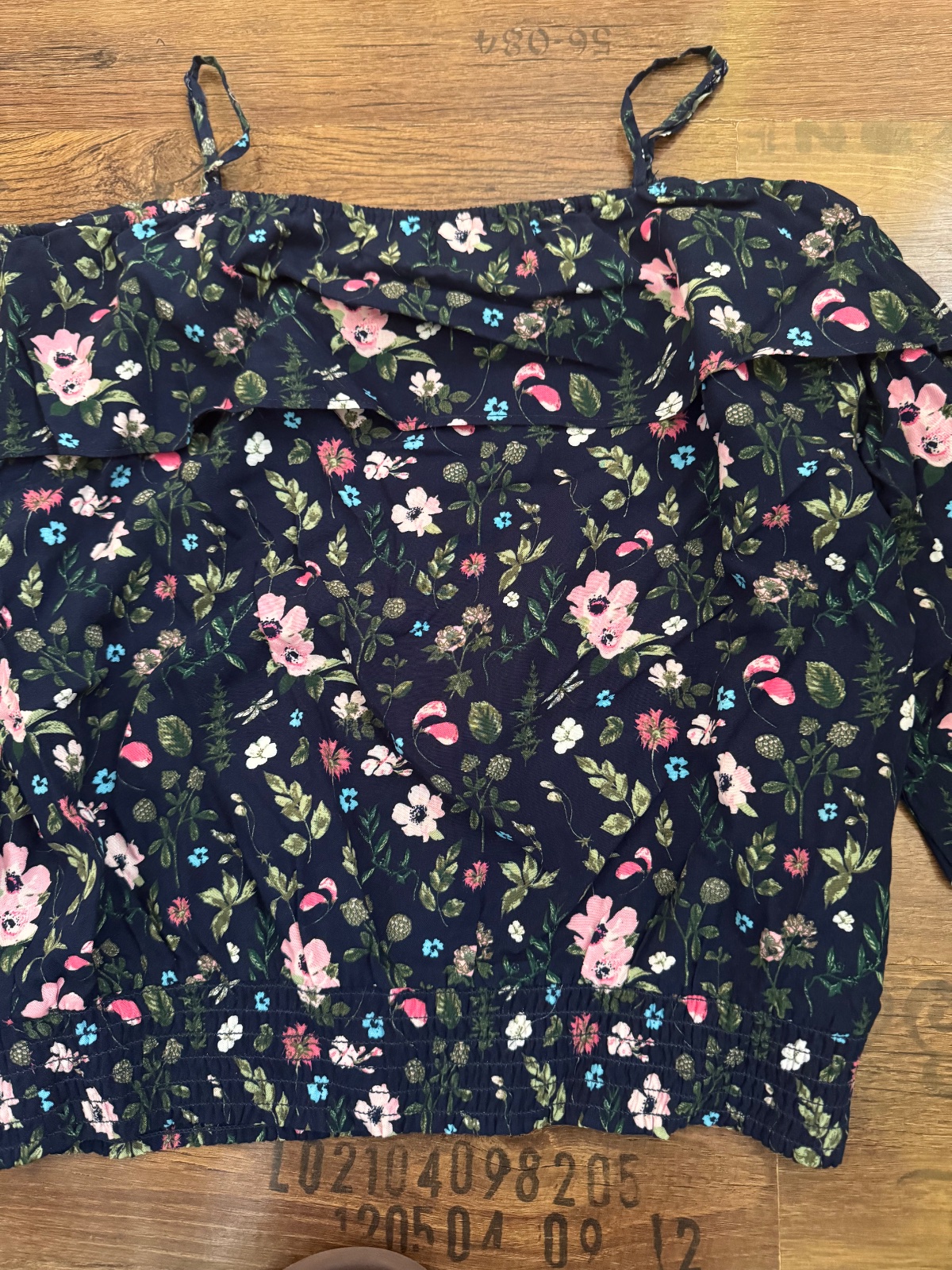 Ponúkam krásne netradičné tričko tmavomodrej farby s potlačou farebných kvietkov. Je na ramienka a nižšie efektný volánik. Je značky H&M a vo veľkosti 164 13-14 rokov ale kľudne sadne aj na XS. Bolo oblečené max 2 razy, naďalej vo vynikajúcom stave. Poštovné podľa taríf.