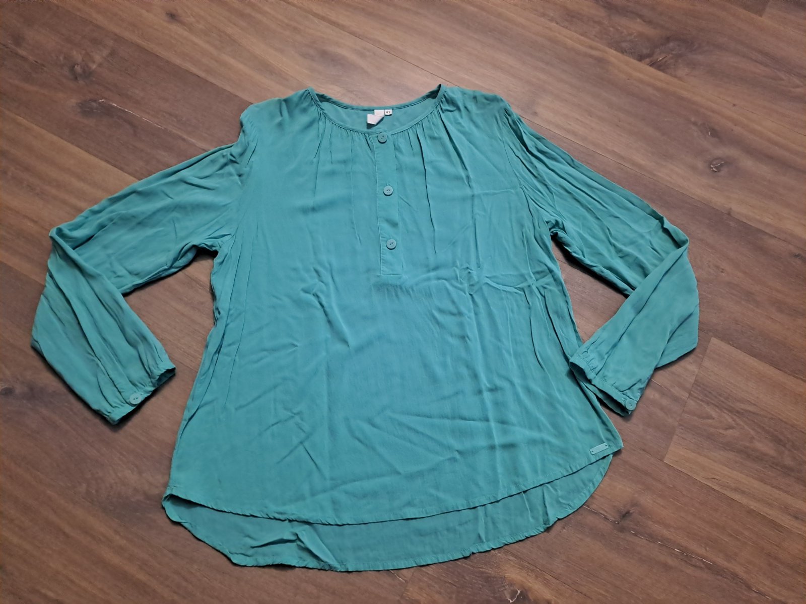 Pekná blúzka z polyesteru. Dĺžka - 66 cm, šírka - 2x 55 cm, rukáv od krku - 74 cm.