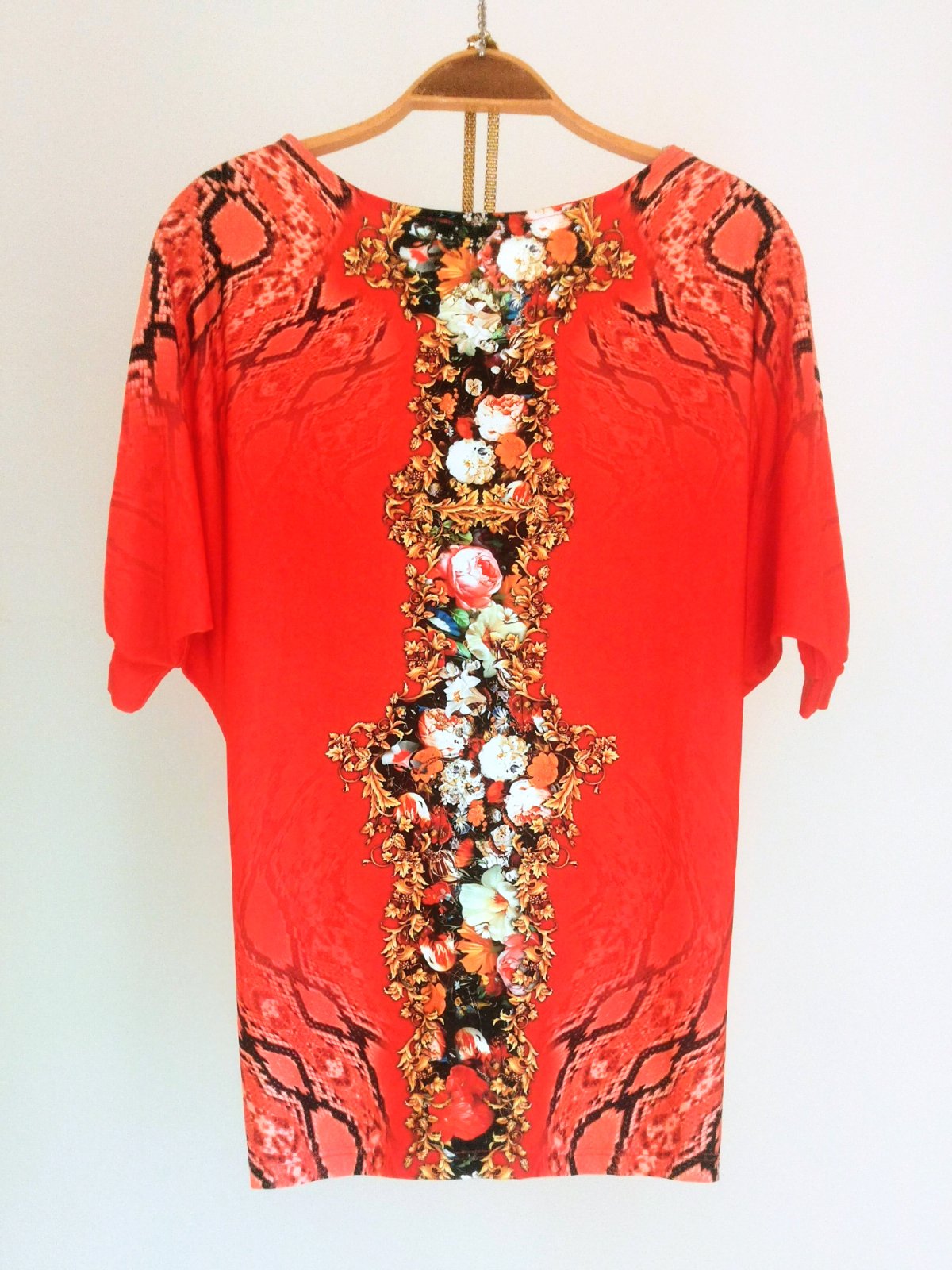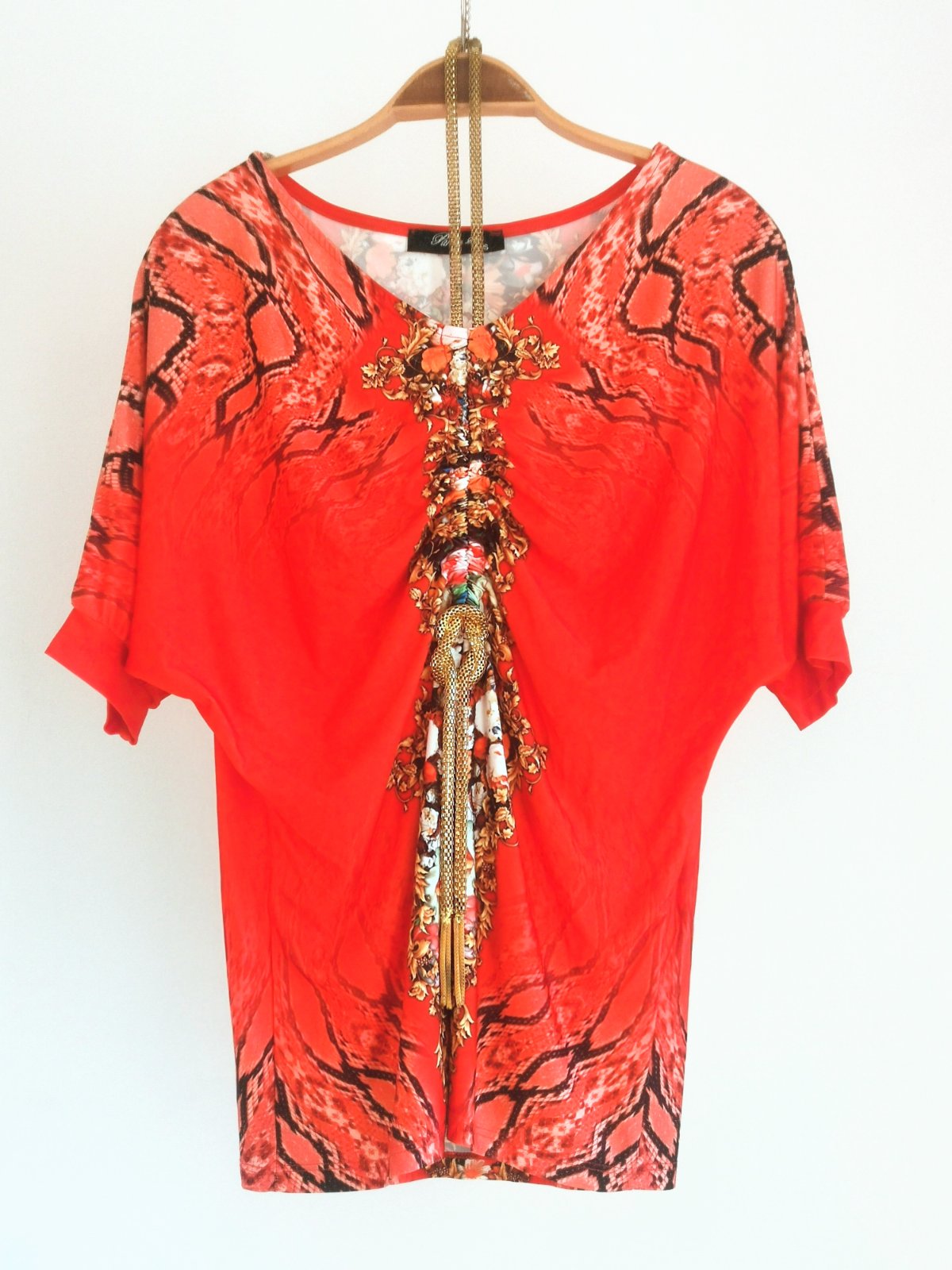 Na konci má efektný uzol (viď foto). Vďaka širokým rukávom, strihu do písmena T sa pohodlne nosí a vďaka zlatej retiazke si môžete výstrih buď zväčšiť, alebo zmenšiť (sťahovaním, pritom vytvára tzv. drapovanie). Naozaj ojedinelý kúsok, ktorý dýcha luxusom a je ozajstným pútačom!