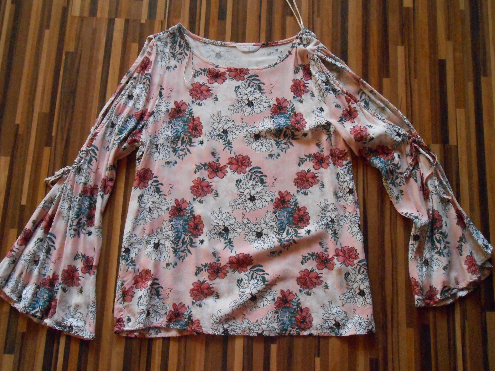 Blúzka v TOP stave, bez dier, fľakov, žmolkov, veľkosť 40, príjemný materiál, nekrčivý, rukávy sú zaujímavo riešené od ramena po lakeť je odhalená ruka (viď foto), dĺžka 58cm, šírka v podpazuší 46cm x 2, dĺžka rukávu meranú od krku 63cm. Cena + poštovné. (K)