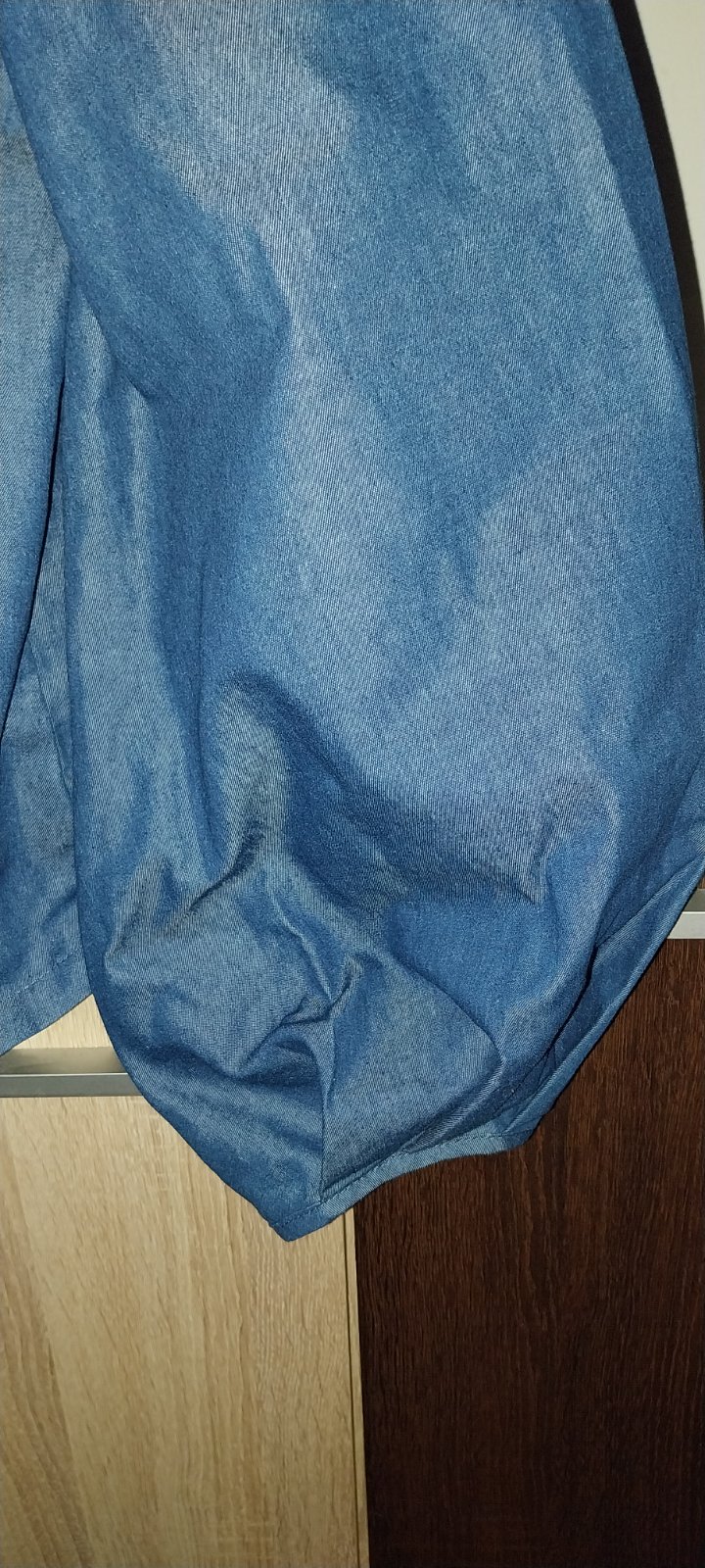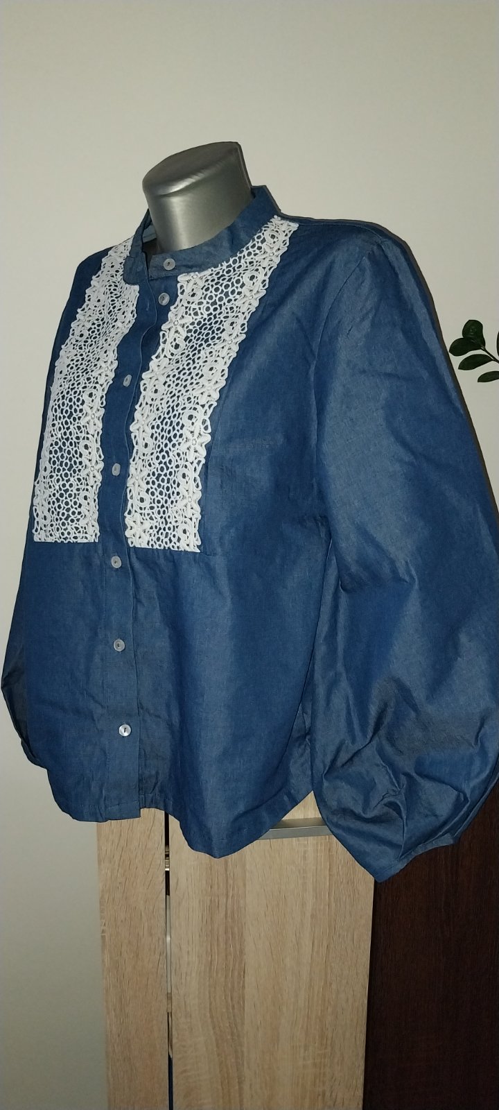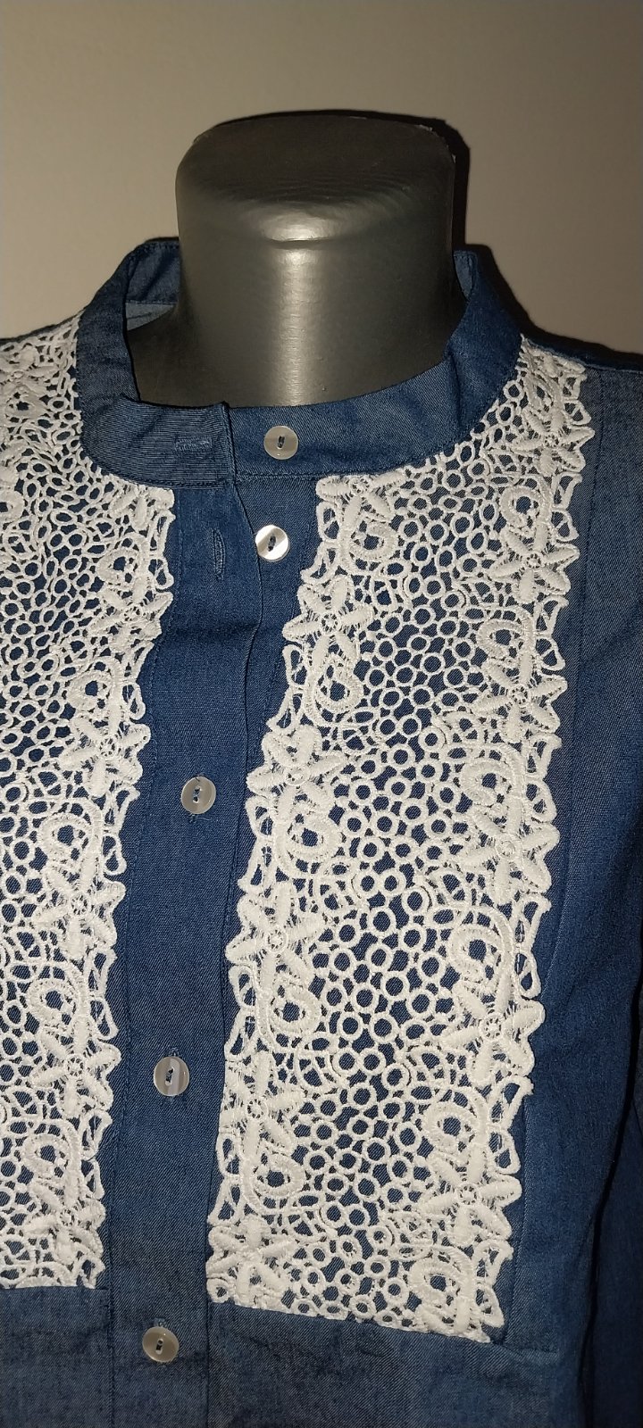 Tenká blúzka zo 100% bavlny v perfektnom stave. Cez prsia má 2 x 55 cm, dĺžka 75 cm. Dlhý rukáv sa dá vyhrnúť na 3/4. Farba je atramentovo-modrá.