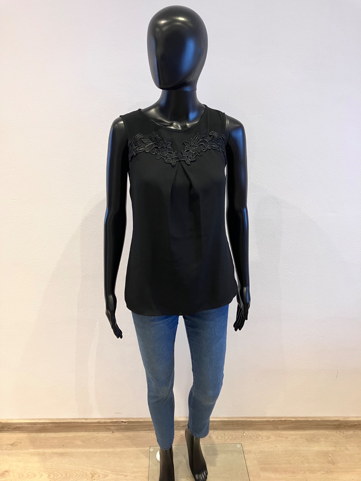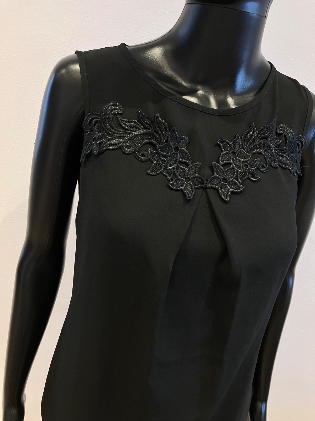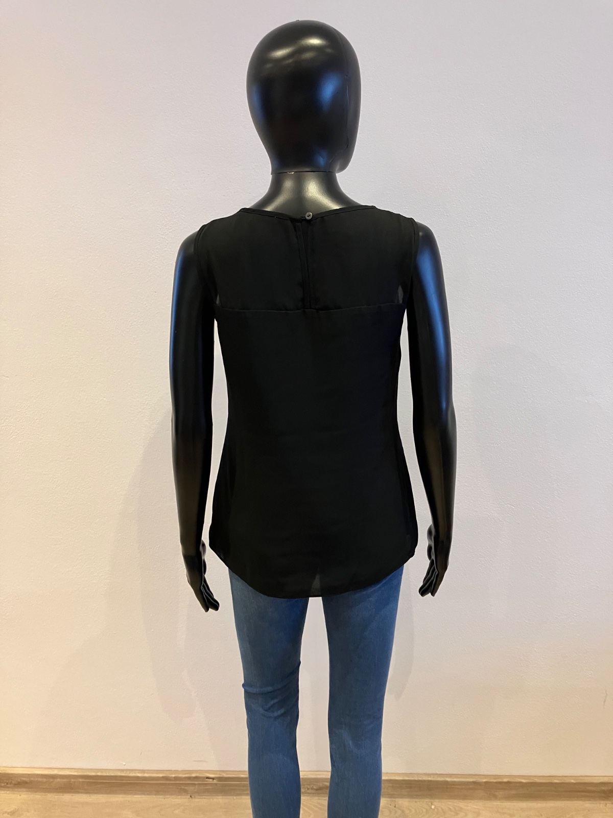 Dámska čierna blúzka bez rukávov, zapínanie vzadu na jeden gombík, nie je elastická, podšitá, materiál 100% polyester.