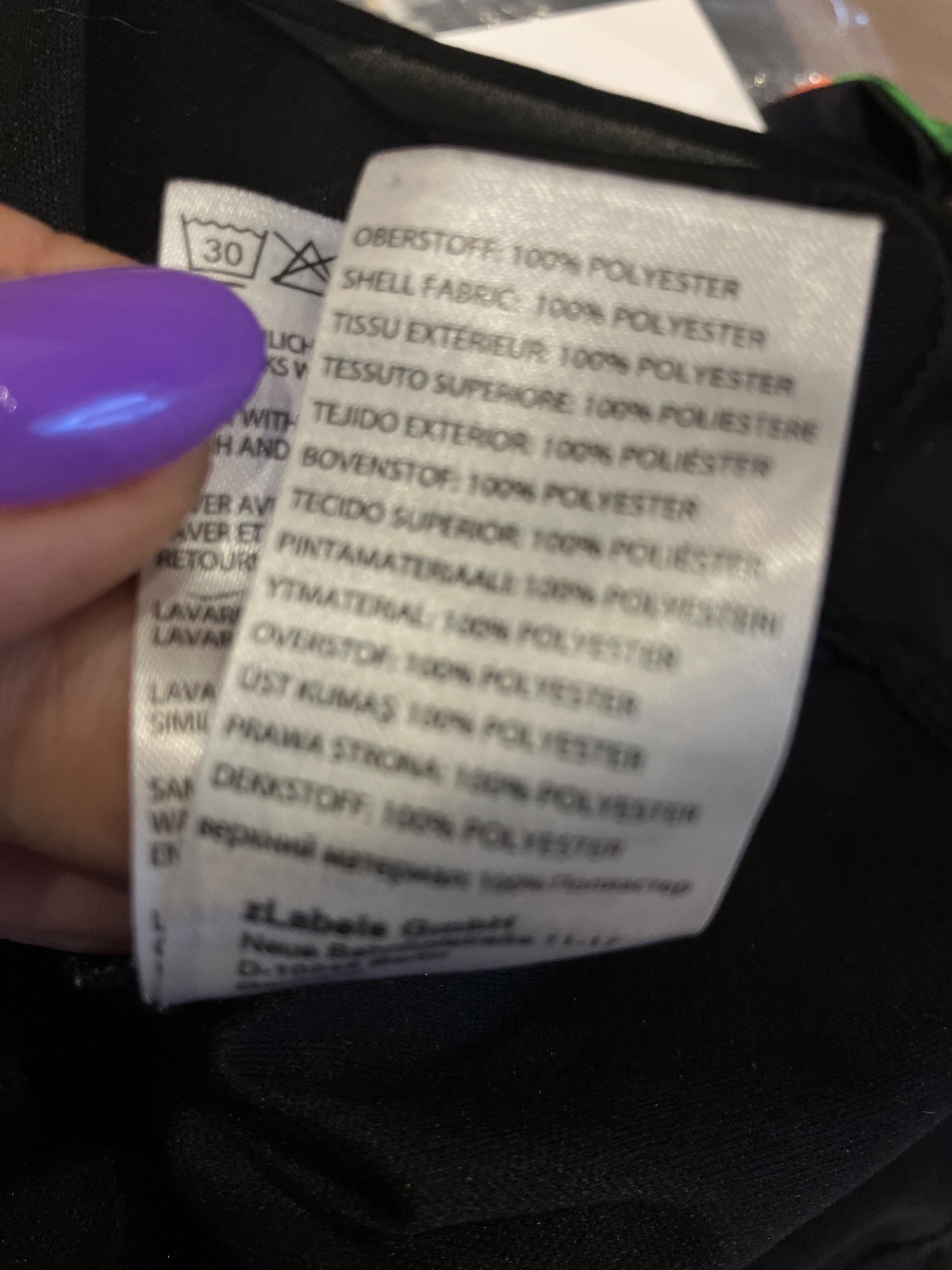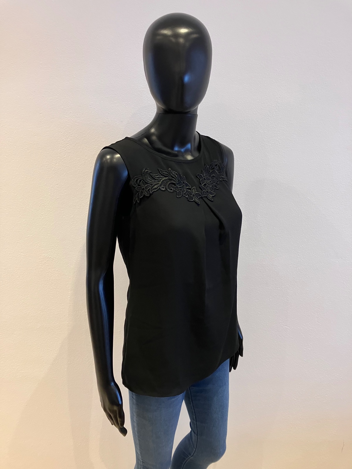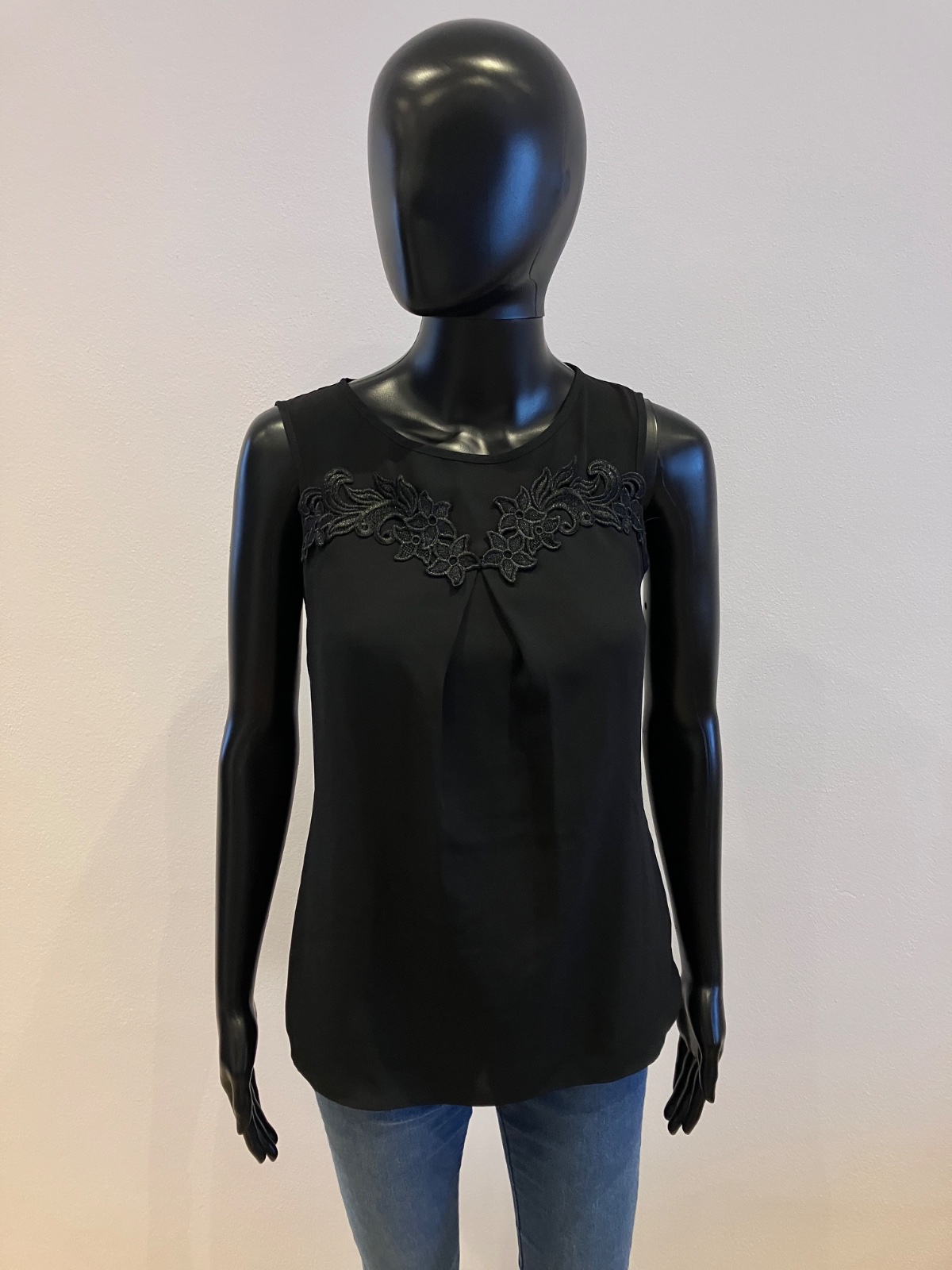 Dámska čierna blúzka bez rukávov, zapínanie vzadu na jeden gombík, nie je elastická, podšitá, materiál 100% polyester.
