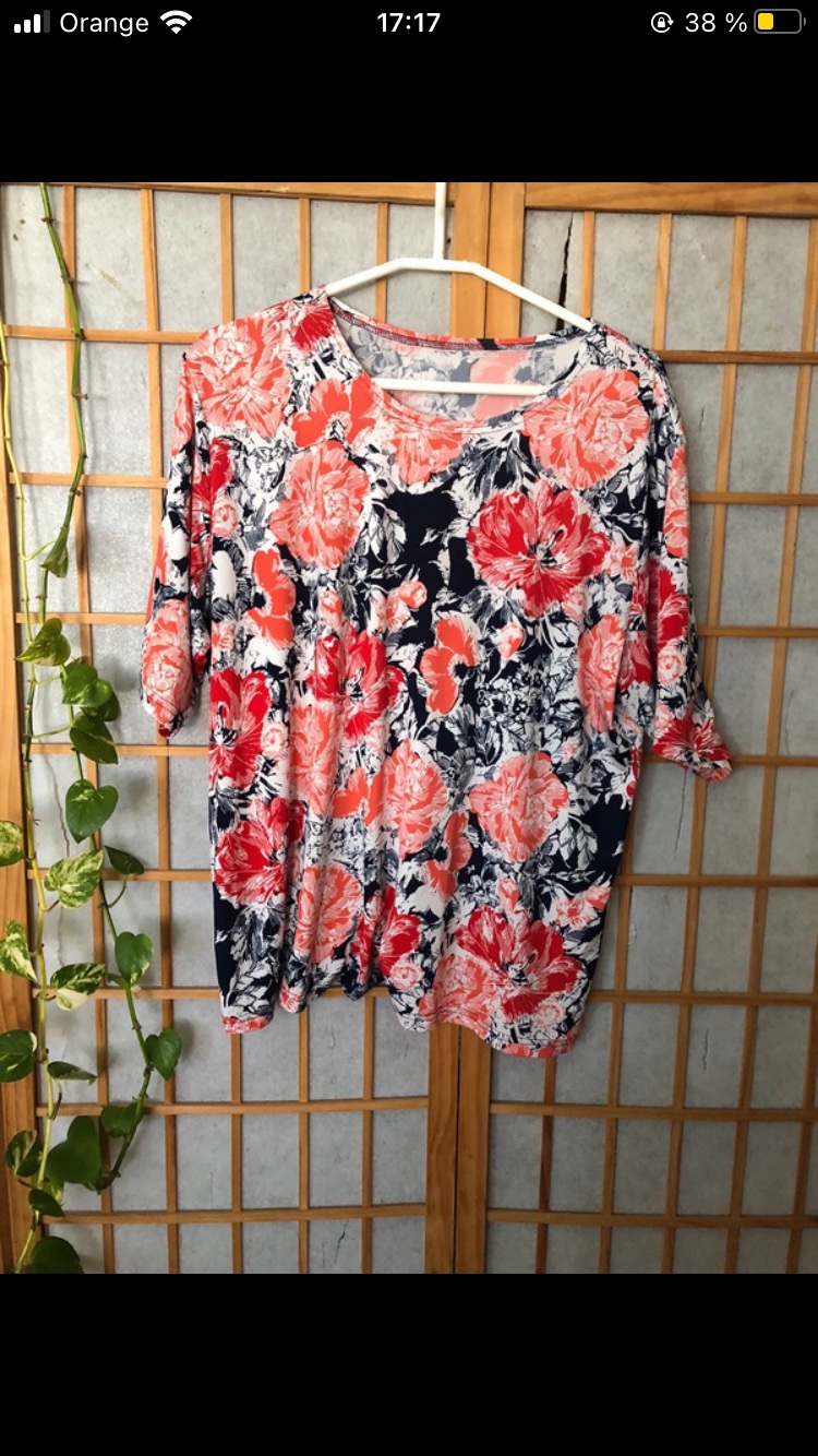 Korálový top s čipkou na rukávoch, veľkosť XXXXL. Materiál je 95% viskóza. Miery hrudník: 2x71cm dĺžka vpredu: 73cm dĺžka vzadu: 78cm