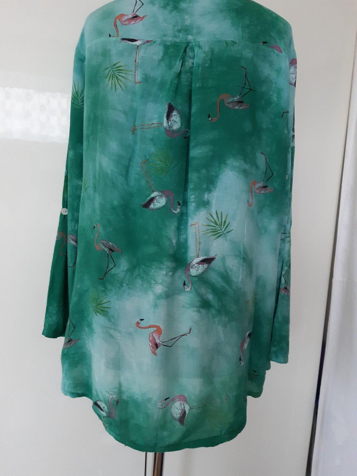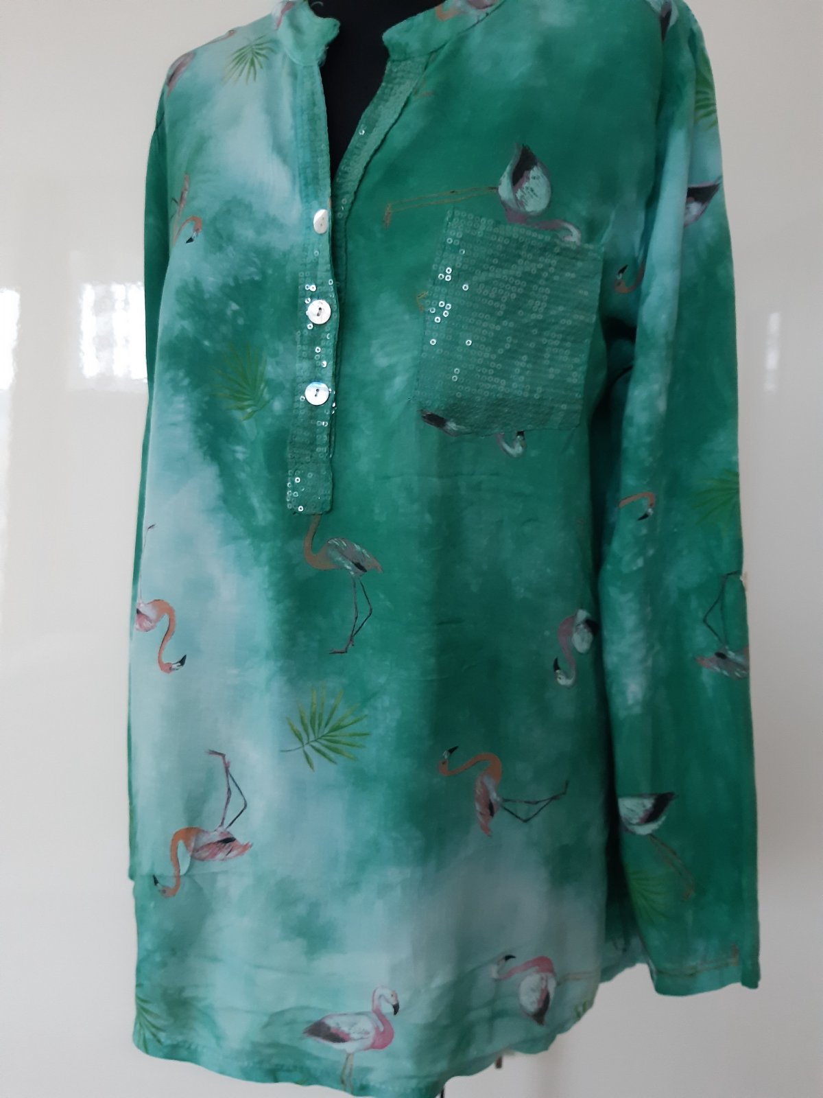 Pekná, letná blúzka, MADE IN ITALY. Je to kvalitná 100% viskóza, vzor melírovaný. DL. cez stred chrbta 77 cm, dl, rukáva 58 cm, dá sa ešte vypnúť hore. . Hodí sa pre vyšiu postavu. Predný diel je v strede cca 9 cm kratší. , obidve spodné diely idú k bokom smerom do oblúka, bočná dl. od ramena je 69 cm . Blúzka je vo výbornom stave, bez poškodenia