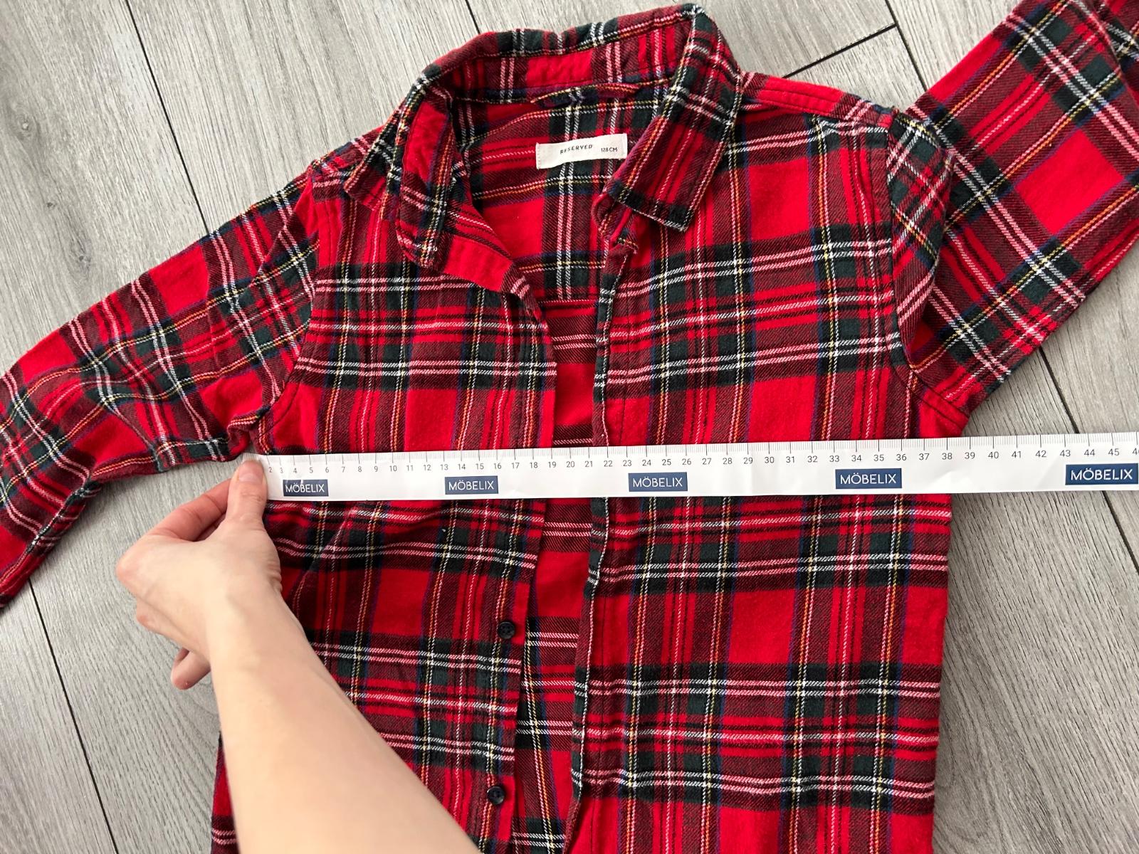 Chlapčenská košeľa zn. Reserved, veľ. 128, materiál 100% bavlna, príjemný flanel. Dĺžka cez chrbát 52 cm, šírka cez prsia 38 cm, vnútorná dĺžka rukávu 36 cm.