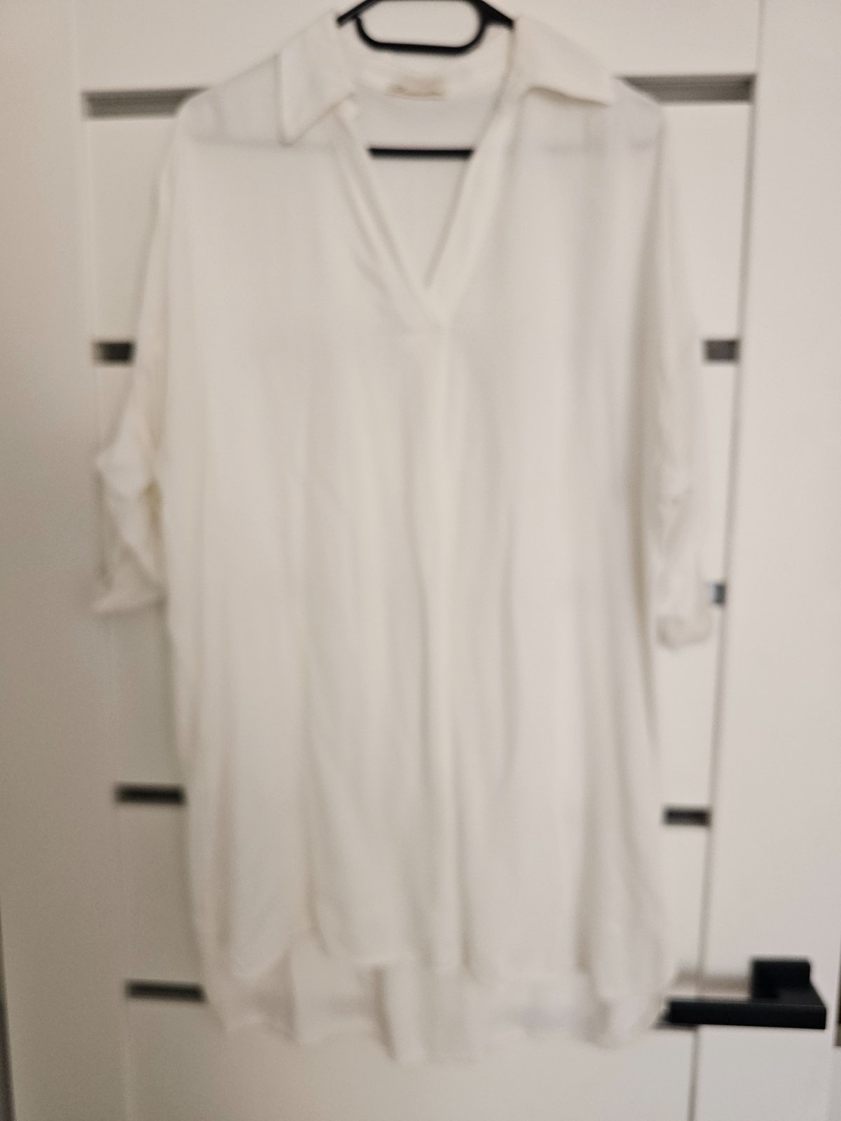 Biela košeľa s kvetinovým vzorom na prsiach. Jemný, padavý materiál. Voľný strih. Vzadu dlhšia. Rukávy sa dajú poskladat do 3/4 a zapnúť o gombík. Sadne na S,M, možno aj L. Málo nosená, bez známok ...