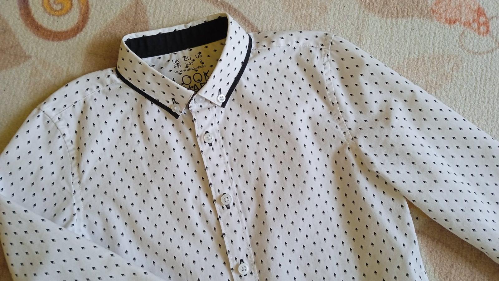 Ponúkam krásnu sviatočnú košeľu pre chlapca. TOP STAV. Nekrčivý materiál. Veľkosť 134. Čierne lemovanie okolo krku a vzory. Rozmery: