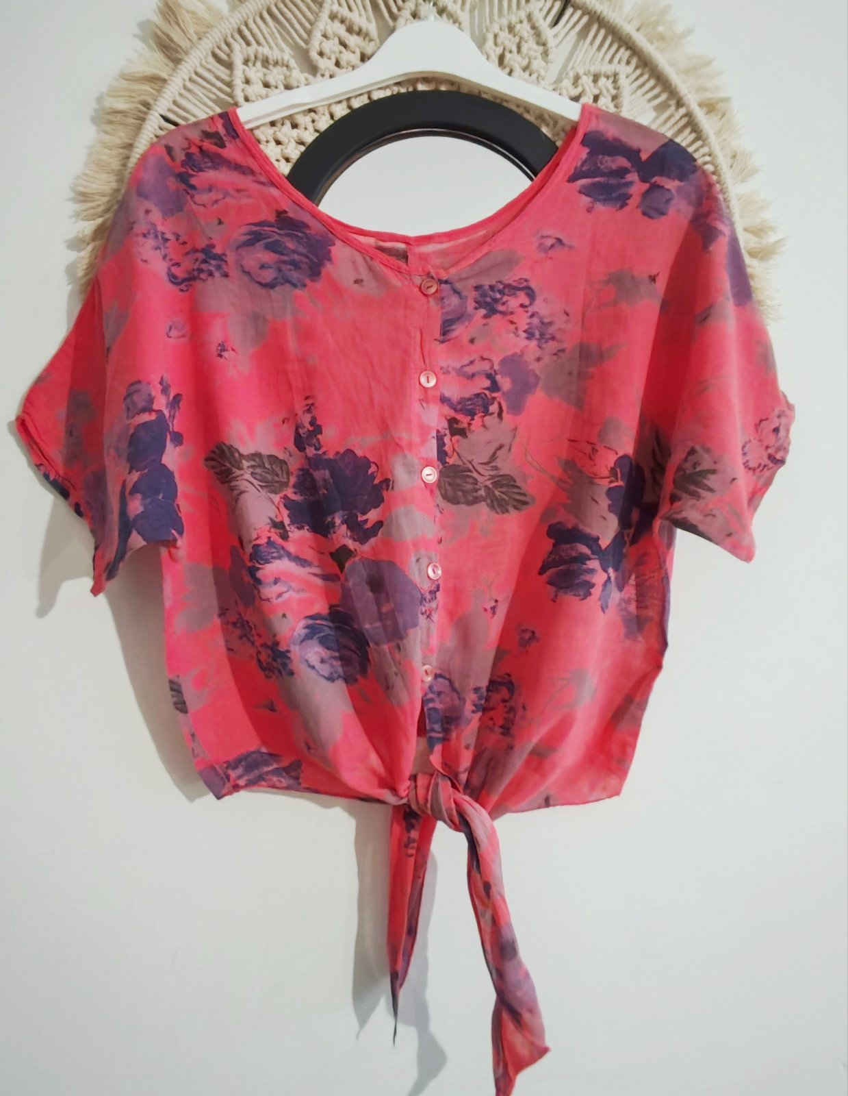 Letná kvalitná blúzka, vnútri je bavlnená podšívka, má niečo ako lodičkový výstrih, vzadu pekne prepletený vzor, má opasok. Je celkom poddajná, Dlžka 64 cm, obvod pása 50 cm. Kupovaná v Poľsku.