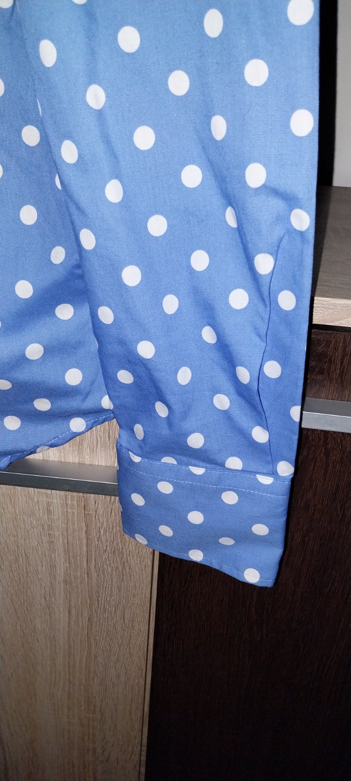 ...pekna ako nová, bielomodra bodka ...dl.chrbta 65 cm, šírka pod paz.52x2 cm, dl.rukáv od krku 75 cm...cena 6€+pošt..