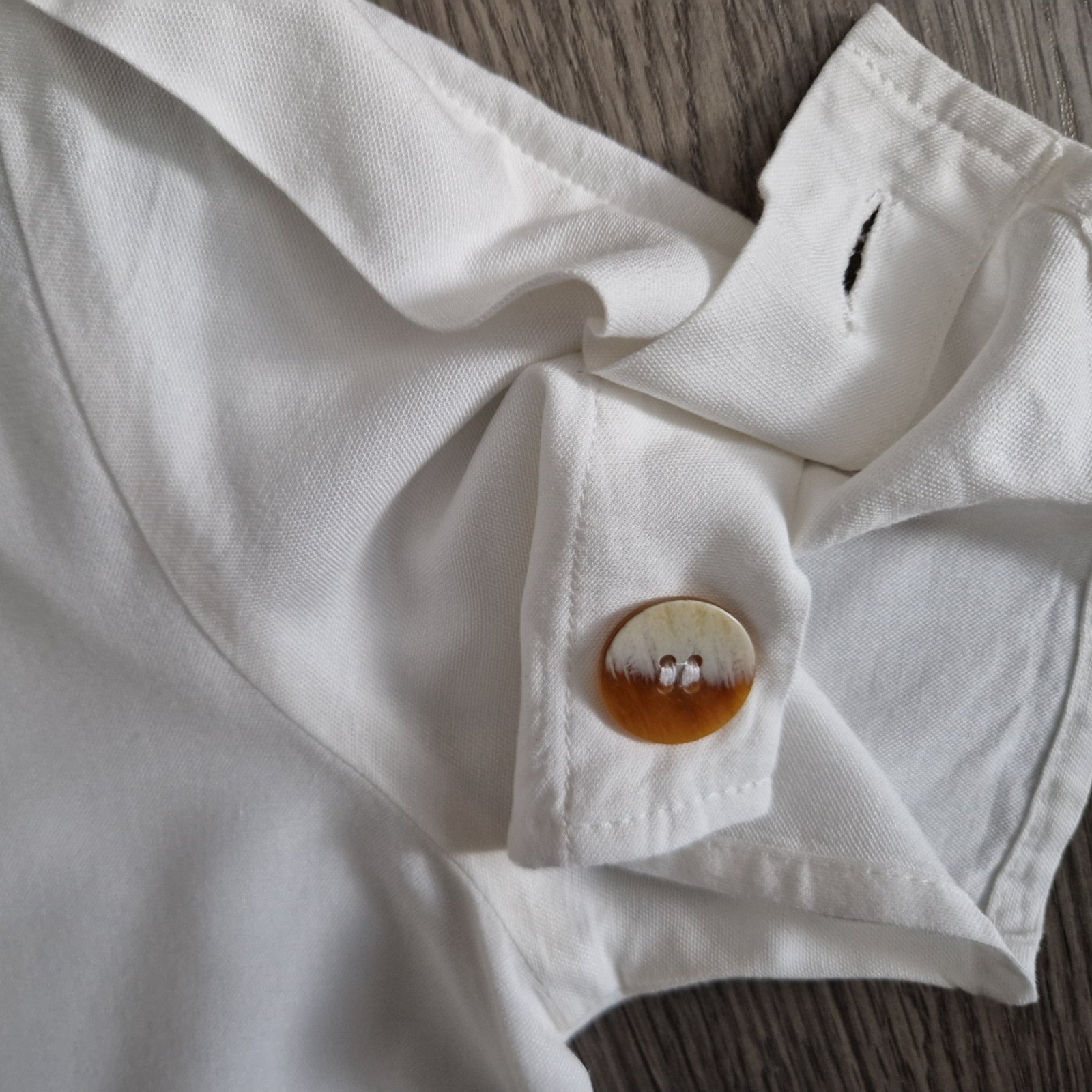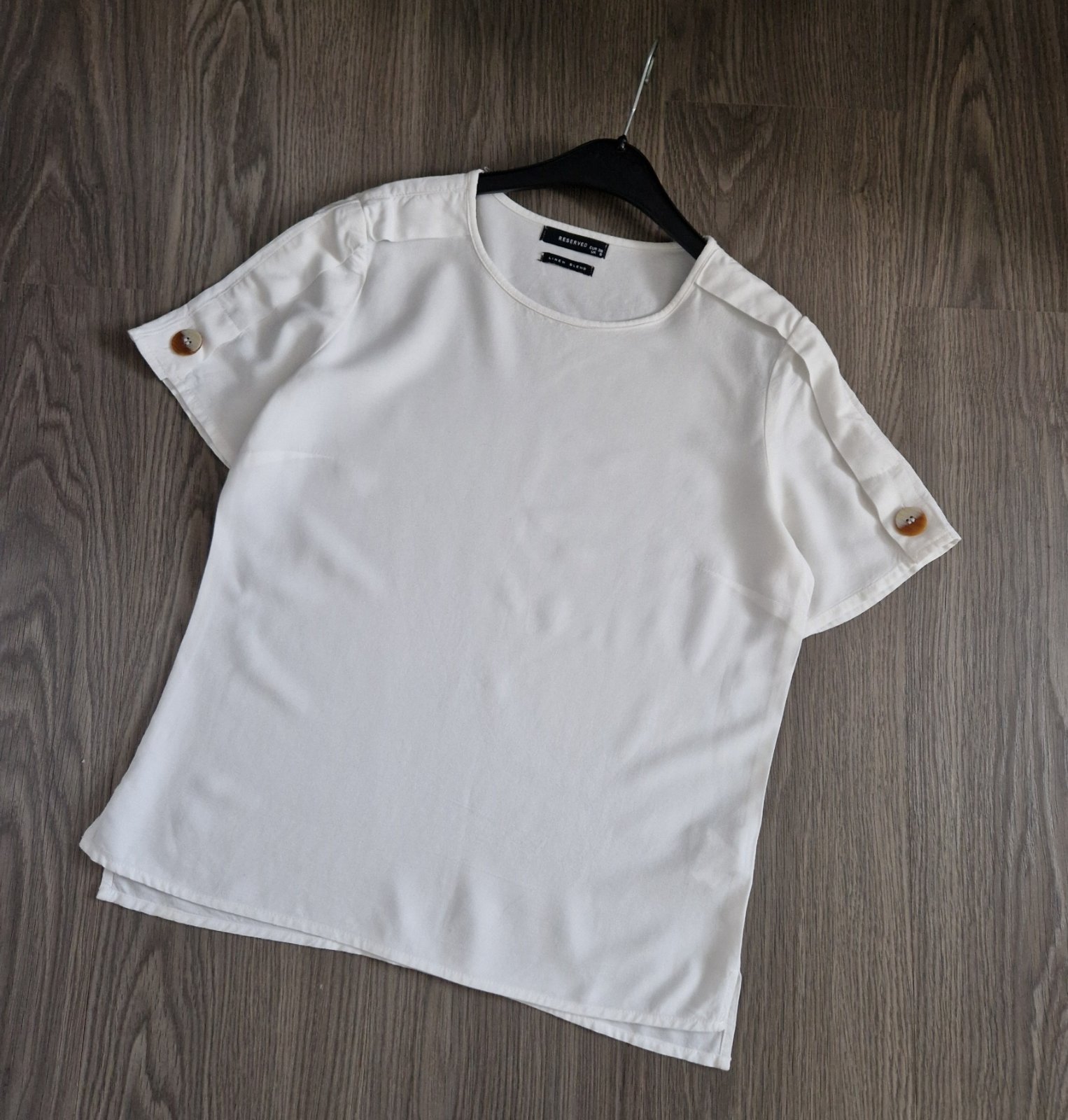 Výborný stav bez známok nosenia. Blúzka zn. Reserved. So zapínaním na gombík na rukáve. Veľkosť S. Materiál: viskóza 95%, ľan 5%. Rozmery: celková dĺžka od pliec 58cm, šírka cez hrudník 2x47cm.