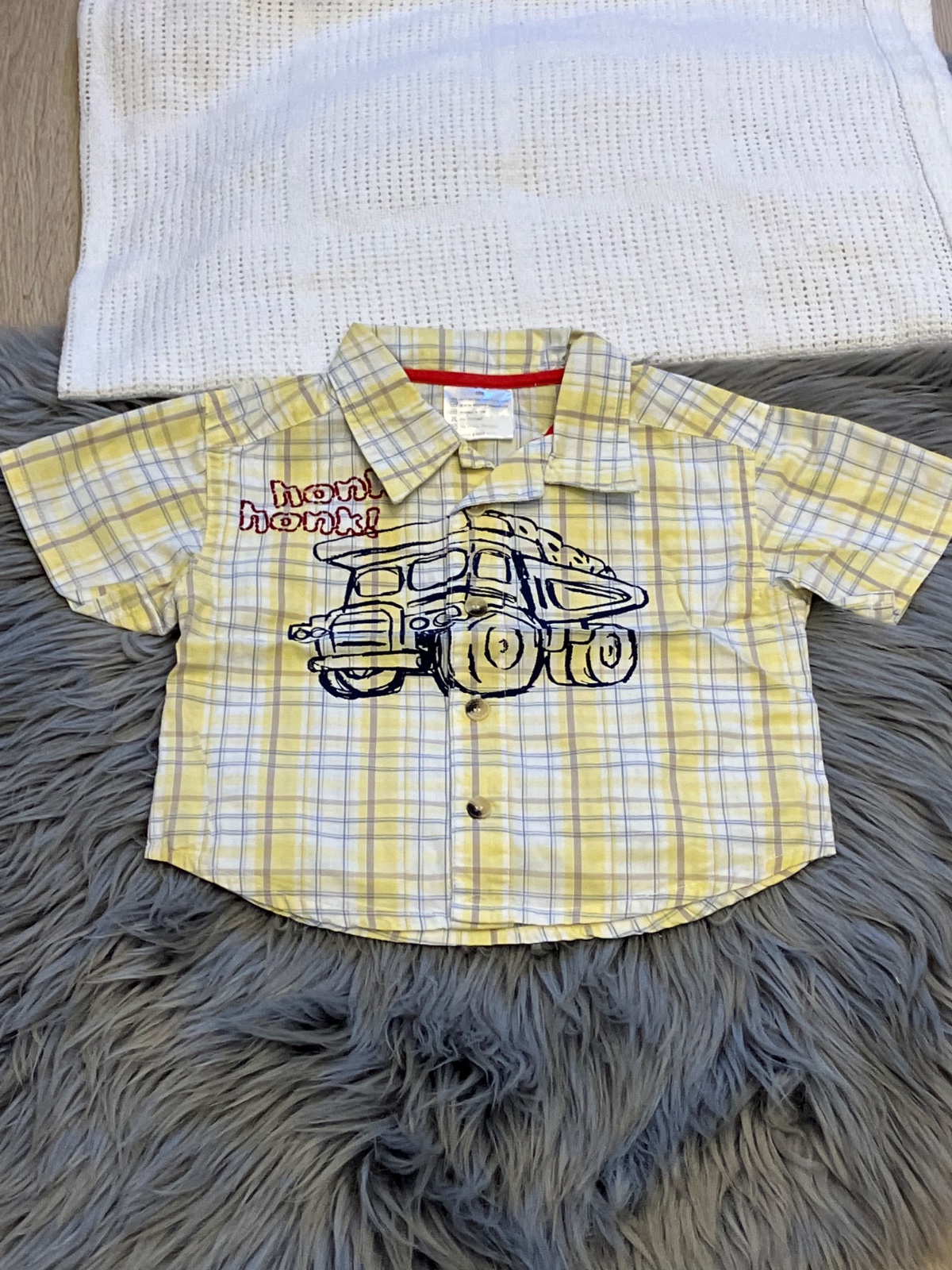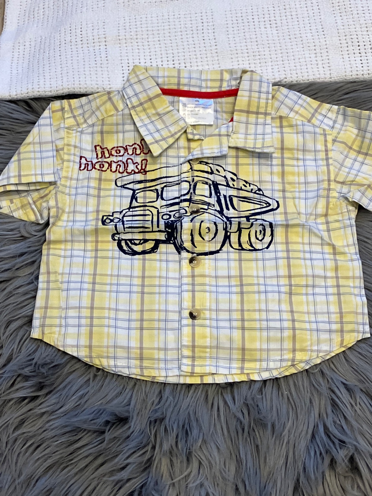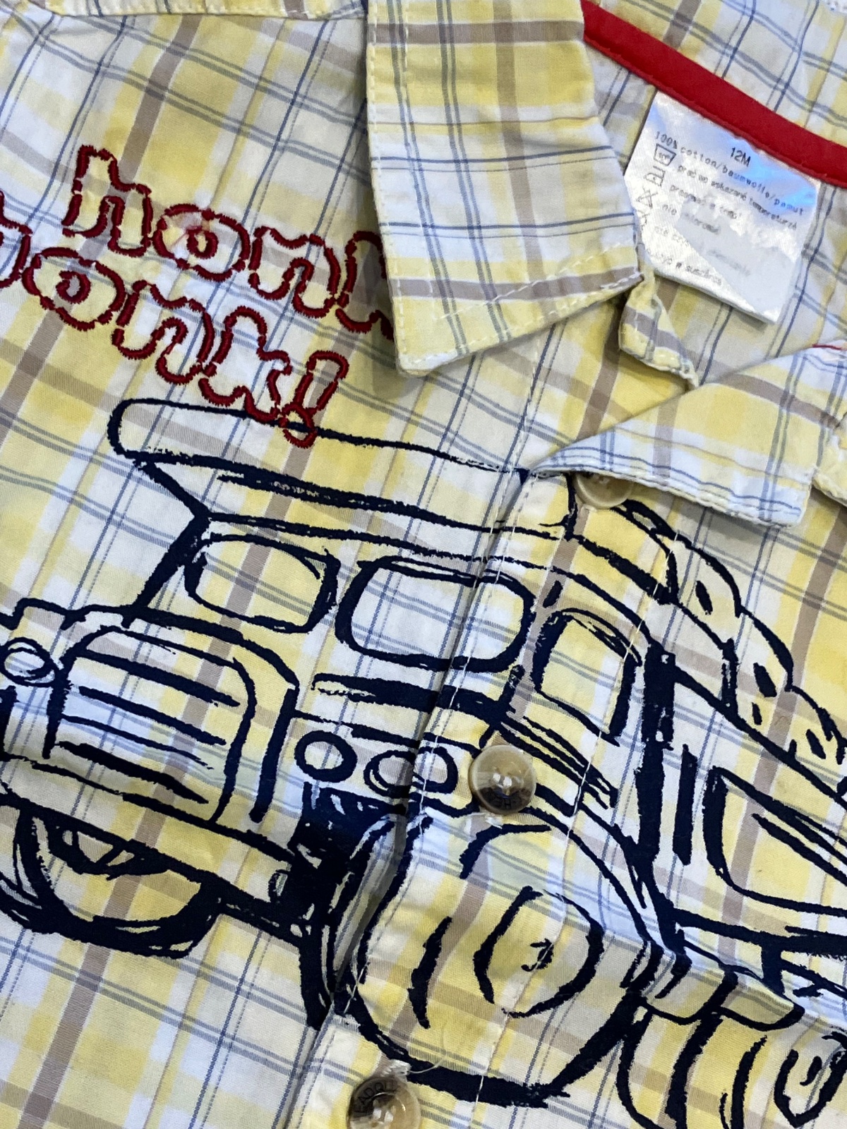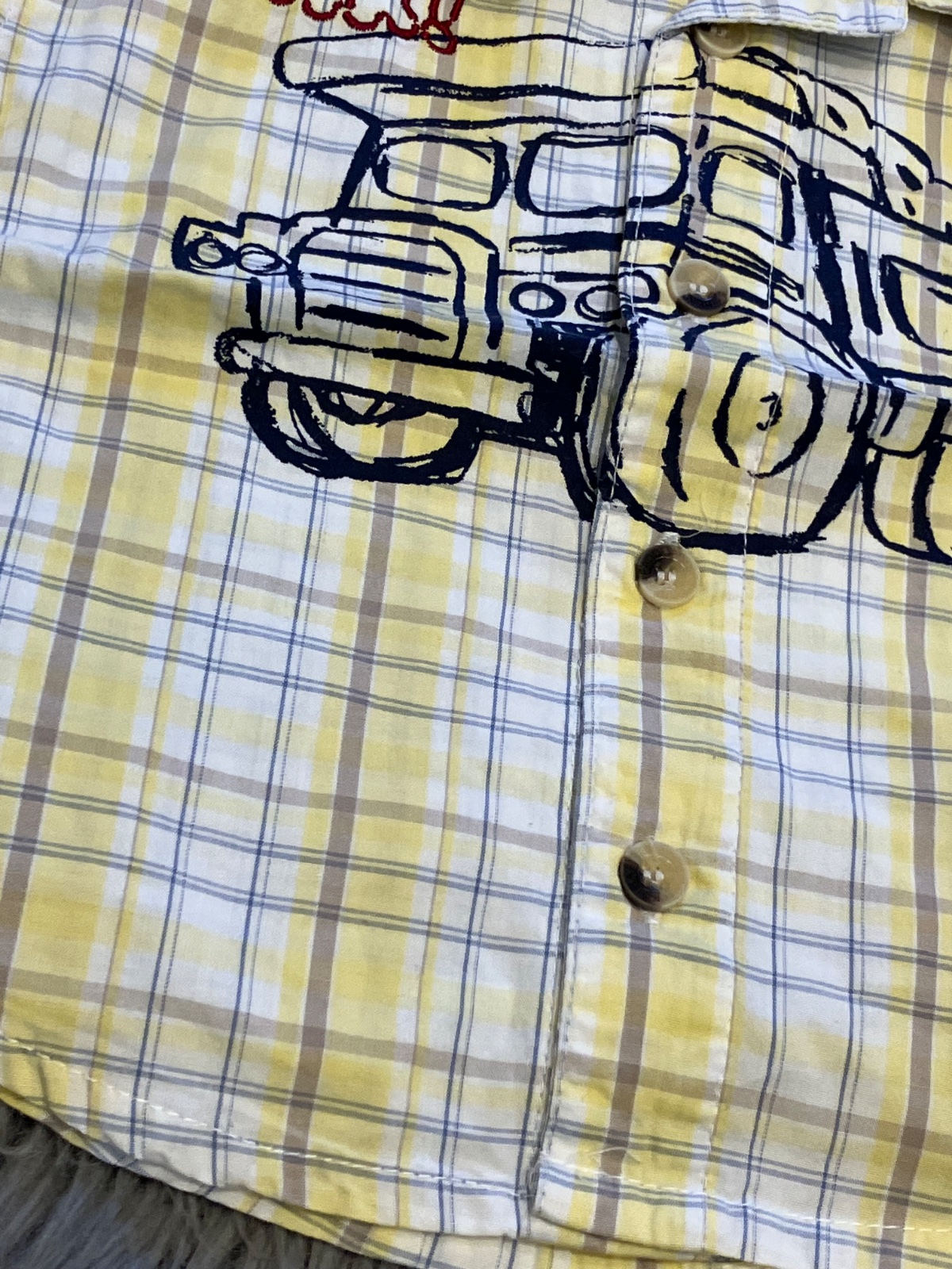 Chlapčenská košeľa s krátkym rukávom, nie je elastická, zapínanie na gombíky, vzor tatry a nápis, farba žlto hnedo modro biela, materiál 100%bavlna.