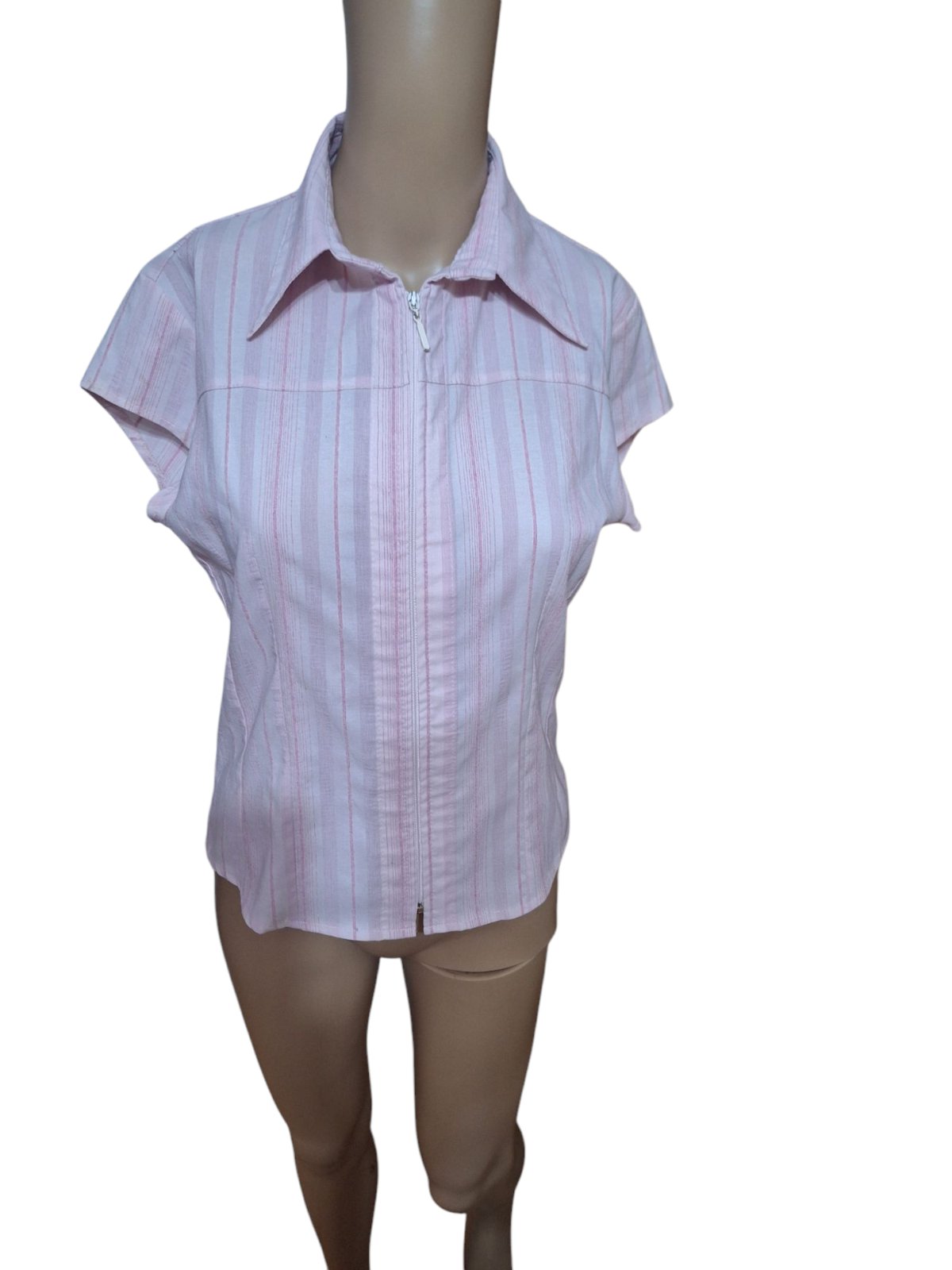 Dámska elastická blúzka. Je pásikavá a vpredu má zapínanie na zips. Dĺžka je 50cm,obvod hrudníka je 96cm a obvod pása je 82cm. kód 1340