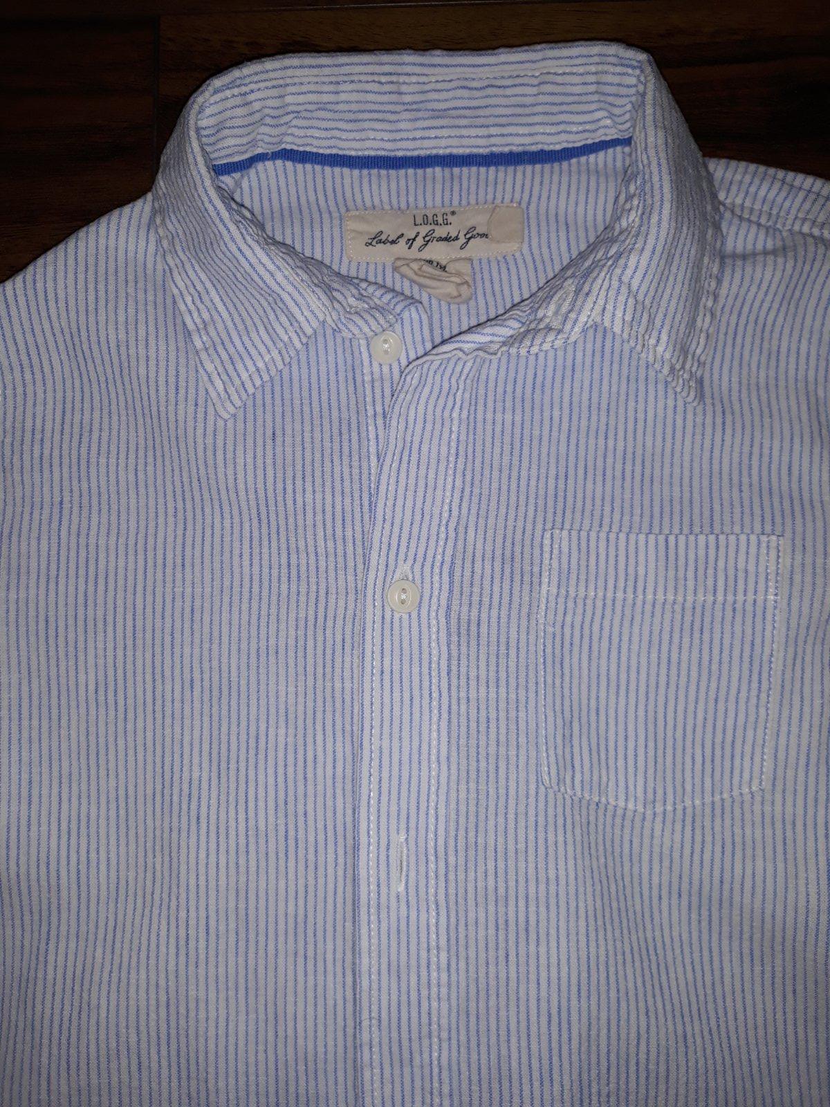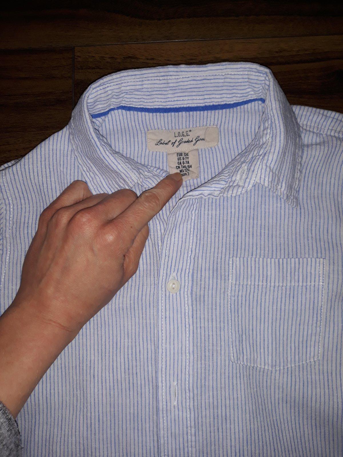 Príjemná biela košeľa s modrými pásikmi, možnosť vyhrnúť rukávy. Veľkosť 122, ale zdá sa mi menšia - rozmery na foto. Bez poškodení.