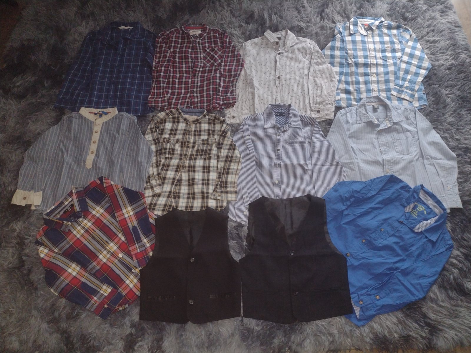 Košele v top stave, cena za ks 5eur. Tmavomodrá H&M 122, bordová Zn. Rebel 122, biela so šedimi kvetinami Zn. Next 116, kockovana modrá Zn. Orig. Marina 116, Modrá Zn. OVS 116, kockovana H&M 116, košeľa Brums 116, bledo modrá Zara 116, kockovana Zn. Text 116, vesta C&A 116, vesta 116 a modrá košeľa 116.