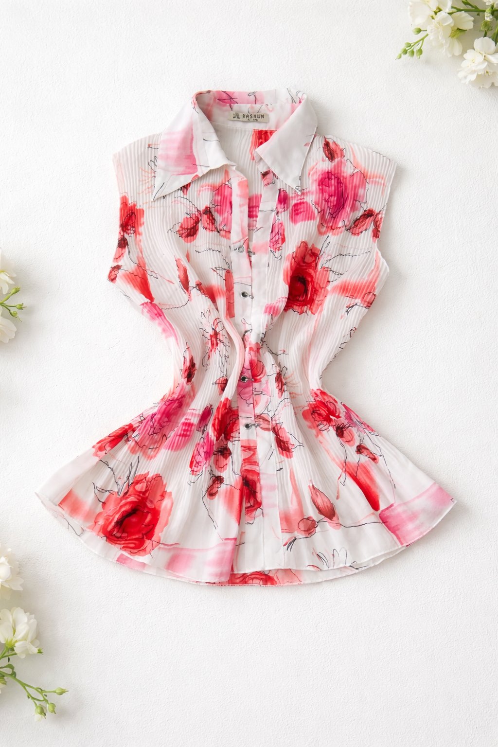 Elegantná a ľahká blúzka v krásnej bielej farbe s červeno‑ružovými kvetmi – ideálna na teplé dni, dovolenky, prechádzky či do mesta. Výrazný vzor dodáva ženský a svieži look a krásne sa kombinuje s džínsami, šortkami aj sukňou.