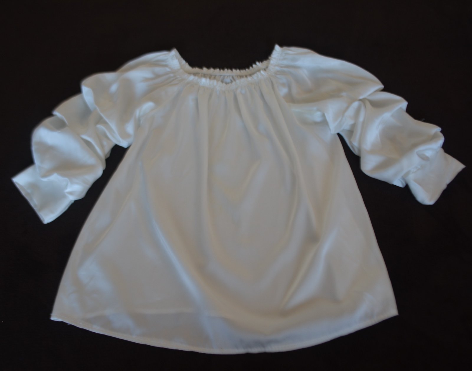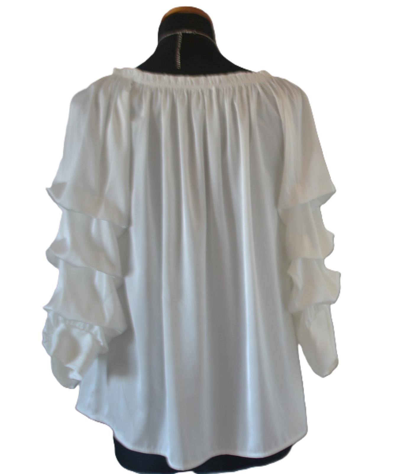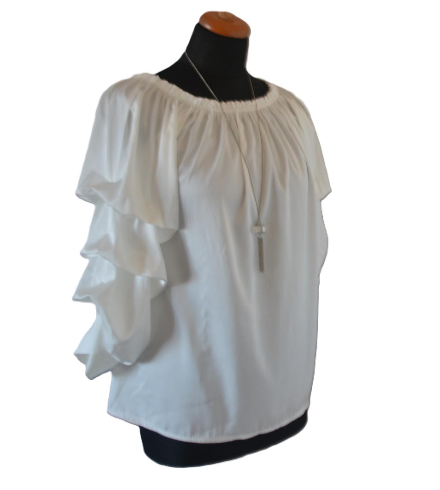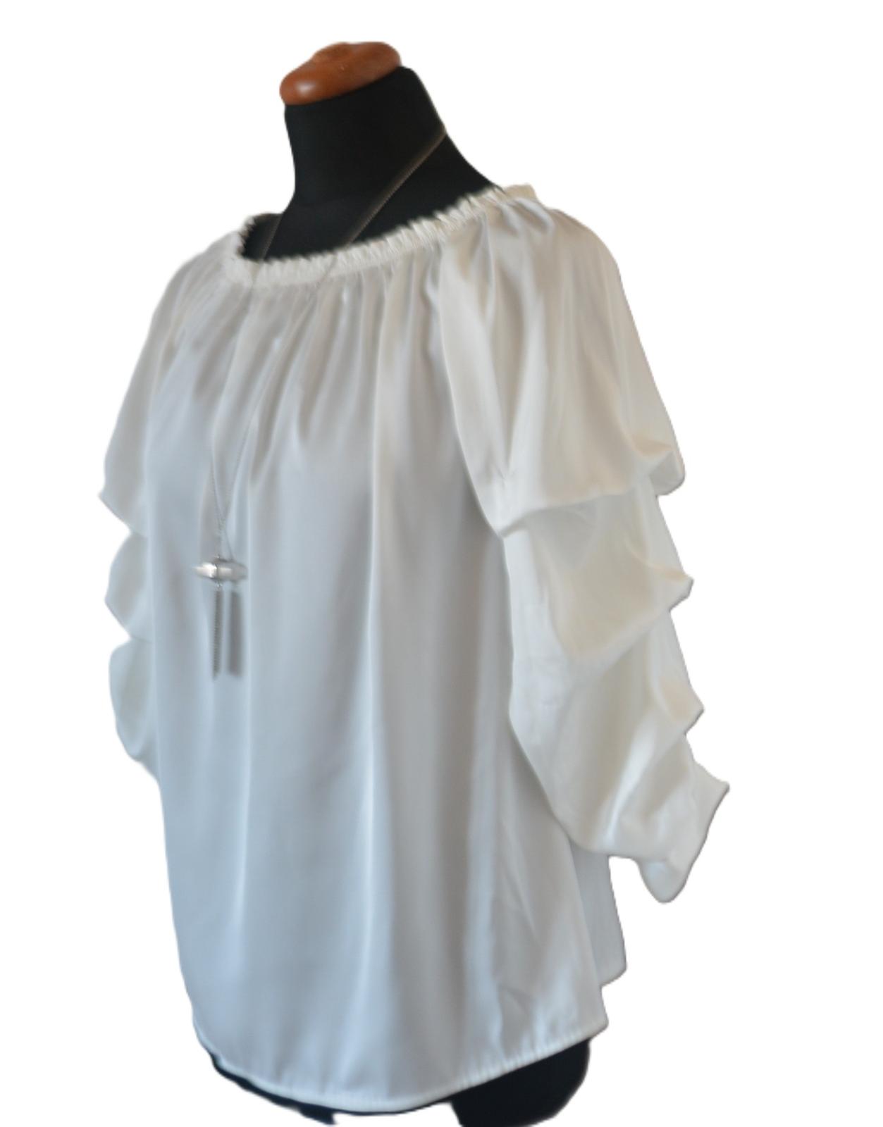 Biela blúzka s atypickými, skladanými rukávmi, veľkostne sedí na L - tu sú rozmery: dlžka 61cm, pod pazuchami 2x52cm, rukáv od krku 48 a od pazuchy 36cm.