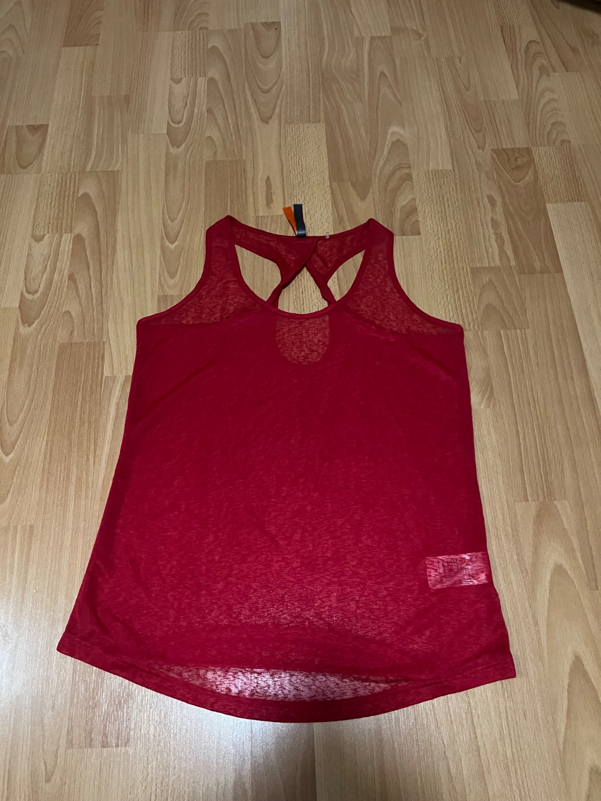 Šifónová blúzka bez rukávov, zapínaním na gombíky po celej dĺžke, náprsnými vreckami a predĺženým zadným dielom. Farba pomarančovo červená, ako na poslednej foto. Veľkosť S/M, dĺžka vpredu 62cm, vz...