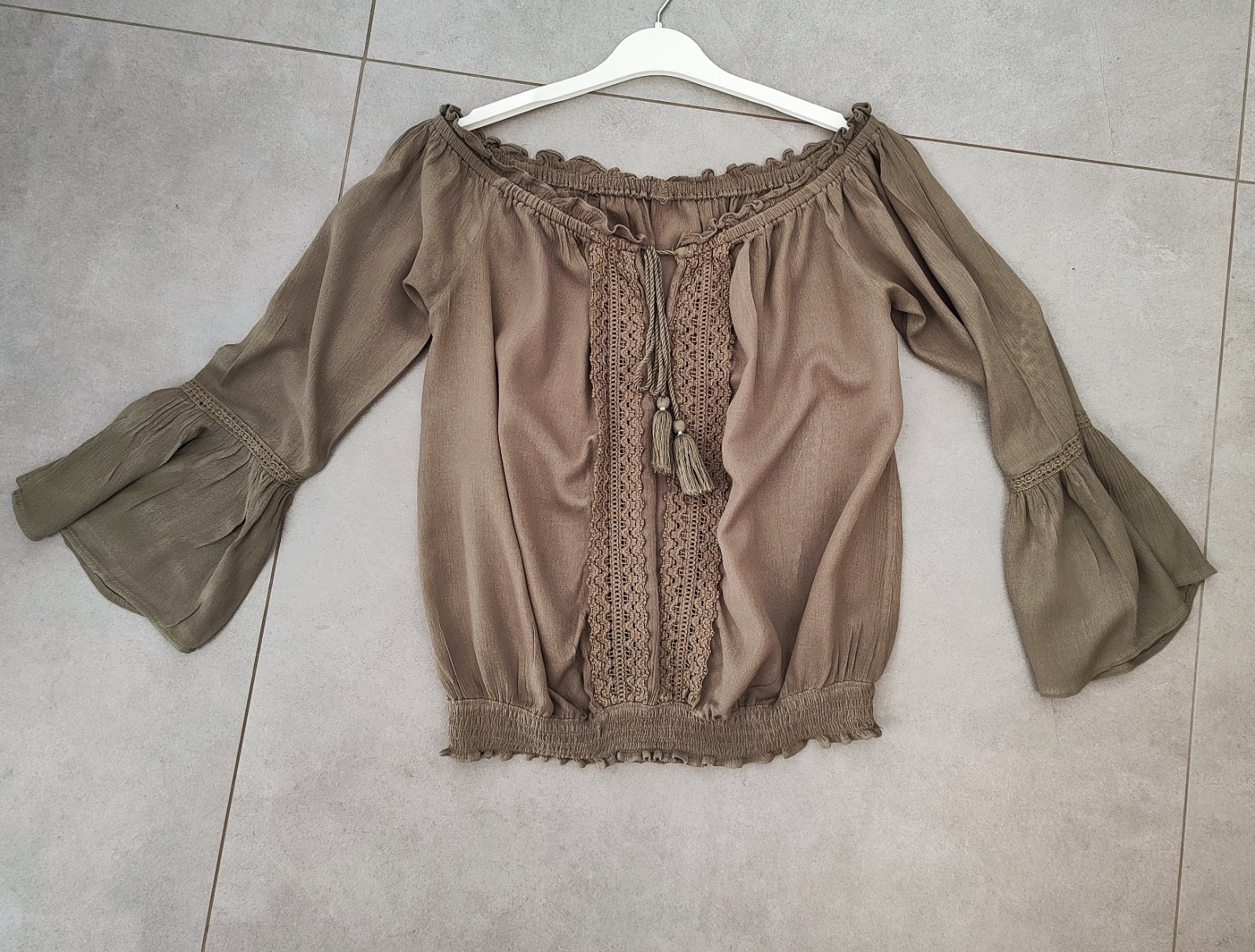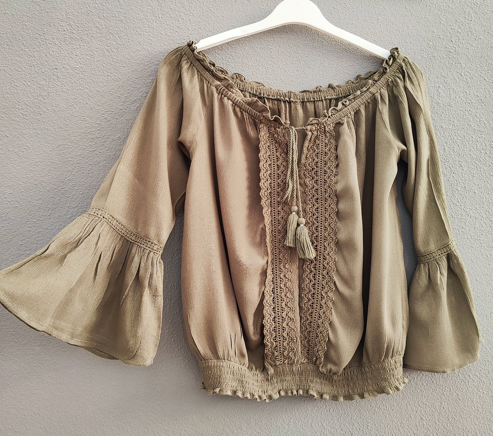 Khaki zelená (olivová) ľahká blúzka, top z balvlny, ideálna na leto. Padnuté ramená, dekolt na prispôsobenie šnúrkou. 3/4 volánové rukávy. Veľkosť 38-40 Mám ju aj v bielom, ale vo väčšej veľkosti....