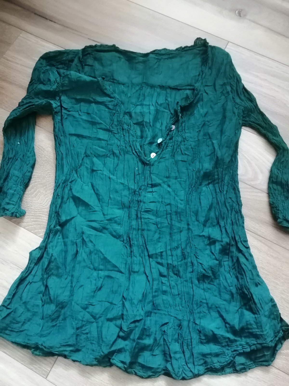 Dámska ľahká košeľa oblečená 1x. Materiál príjemný,100 % bavlna. Šírka - 59 Predná dĺžka - 89 Zadná dĺžka - 105 Rukávy môžu byť dlhé alebo sa dajú vypnúť ako na foto.