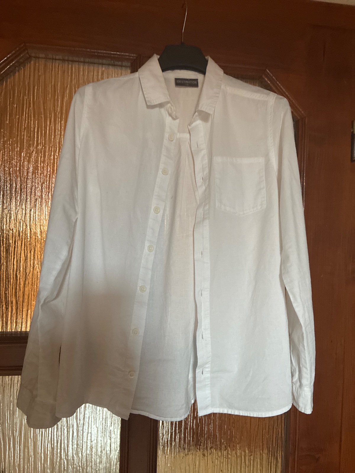 Bledomodrá košeľa, oblečená iba párkrát. Dĺžka je 62 cm a šírka pod pazuchou je 40 cm.