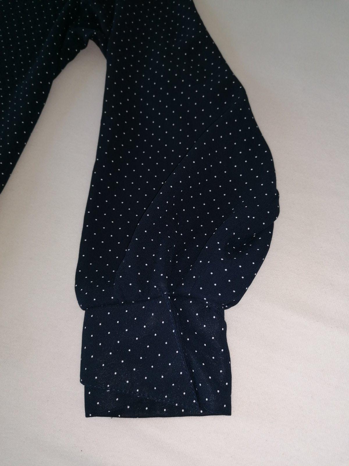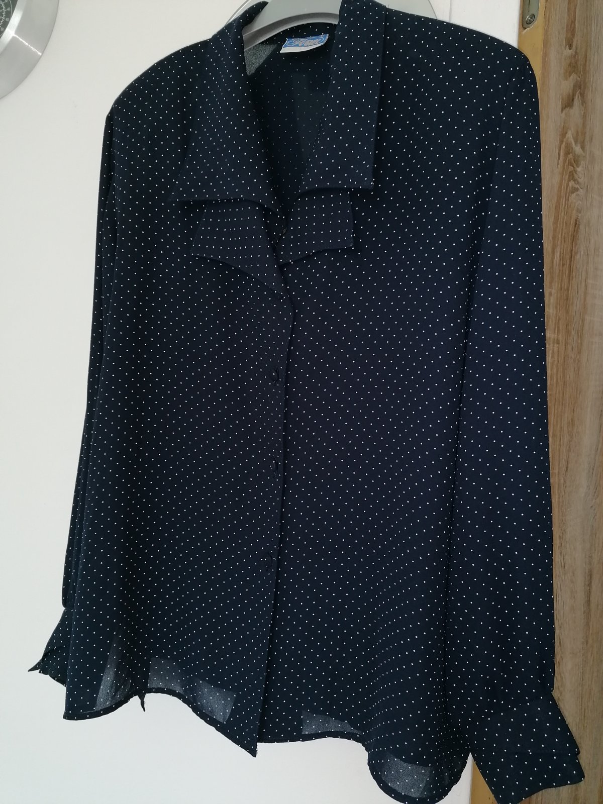 Príjemná, ľahká, bavlnená blúzka s kovovými gombíkmi a volánikmi vo výstrihu, rukávy aj spodok do gumy. Sedí na väčšie M, alebo L. Oblečená 2x. Nenáročná údržba.