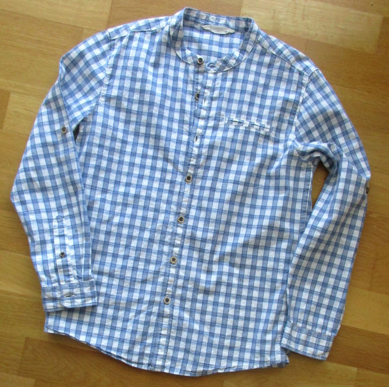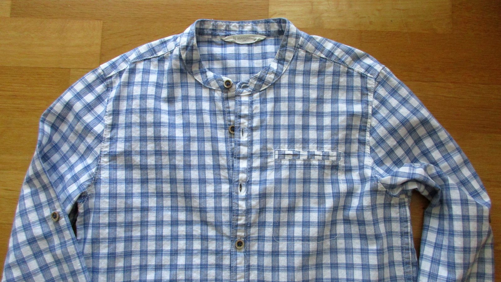 ako nova, len 2x oblecena, bez chyb. Velmi pekna kosela s jemnym karovanym vzorom s drevenymi gombickami. moznost vyhrnut rukavy a zachytit gombikom. Rukav od stojacika64 cm. Dlzka v strede pleca 59 cm, sirka pod pazuchou cca 44 cm.