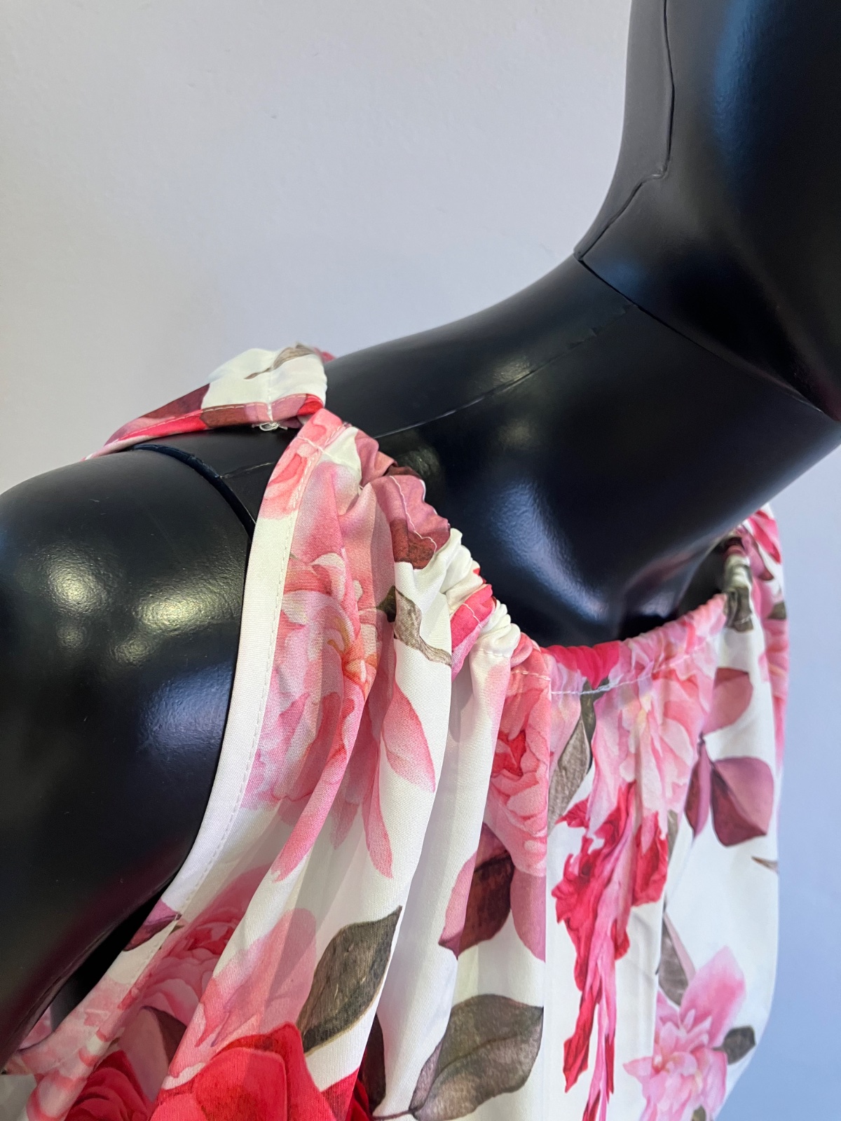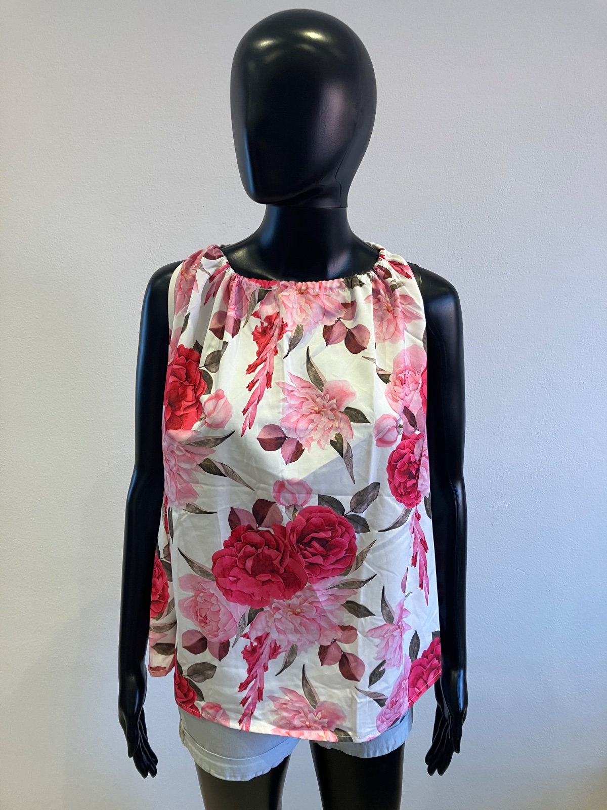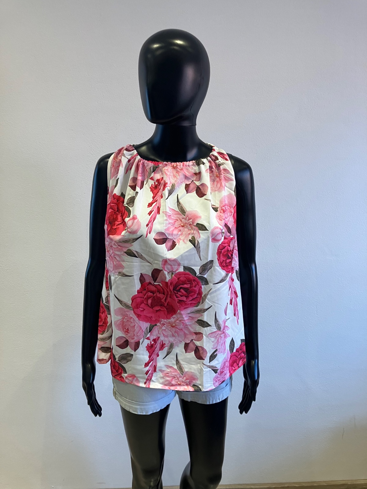 Dámska blúzka bez rukávov, kvetovaná, vzadu na zaväzovanie, nie je elastická, farba ružovo-bielo-zeleno-fialová, materiál 97%polyester 3%elastan.
